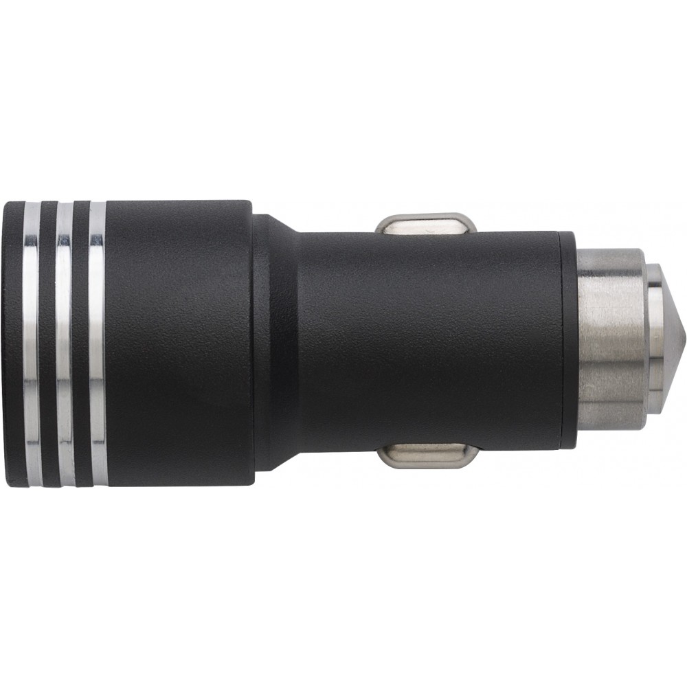 Autós adapter 2 USB kimenettel és vészhelyzeti ablalktörésre alkalmas véggel. Bemenet: DC 12-24V, kimenet: DC 5V/2.4A. Műanyag.