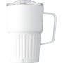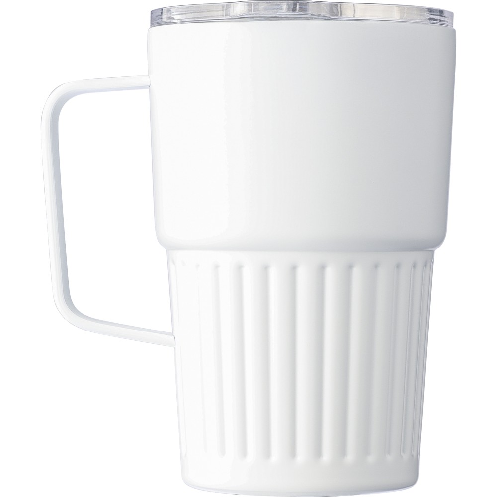 Újrahasznosított rozsdamentes acél útibögre, 450 ml. A belső 304-es, a külső 201-es rozsdamentes acélból készült, bordás markolattal és masszív fogantyúval, műanyag, csúszózáras fedéllel. Gravírozott újrahasznosított logó található a bögrén. Csomagolása barna papírdoboz.