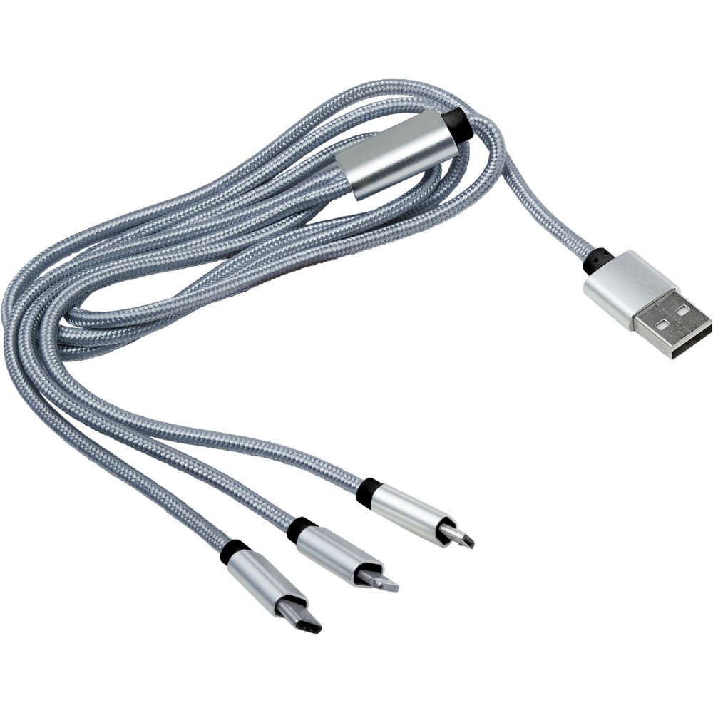 Töltőkábel az egyik végén USB csatlakozóval, a másik végén mikro USB, USB-C és Lightning csatlakozókkal. Nylon.