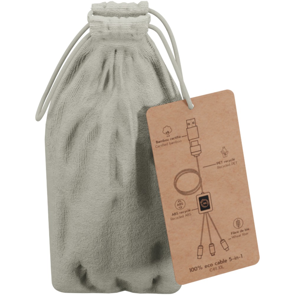 2,4A gyorstöltő kábel (3 x 10 cm), amely mindkét oldalán világító logóval emblémázható. Ez a kábel teljes egészében fenntarthatóbb anyagokból készült: rPET-zsinór, bambusz, búzaszál és újrahasznosított műanyag. A töltőkábel 3 kimenetének (Type-C, Android, iPhone) köszönhetően univerzális és akár három eszközt is képes egyszerre tölteni. Dupla USB és USB-C bemenetének köszönhetően ez a kábel kompatibilis a legújabb töltőkkel. Pamut tasakban (20 x 8 cm) szállítjuk.