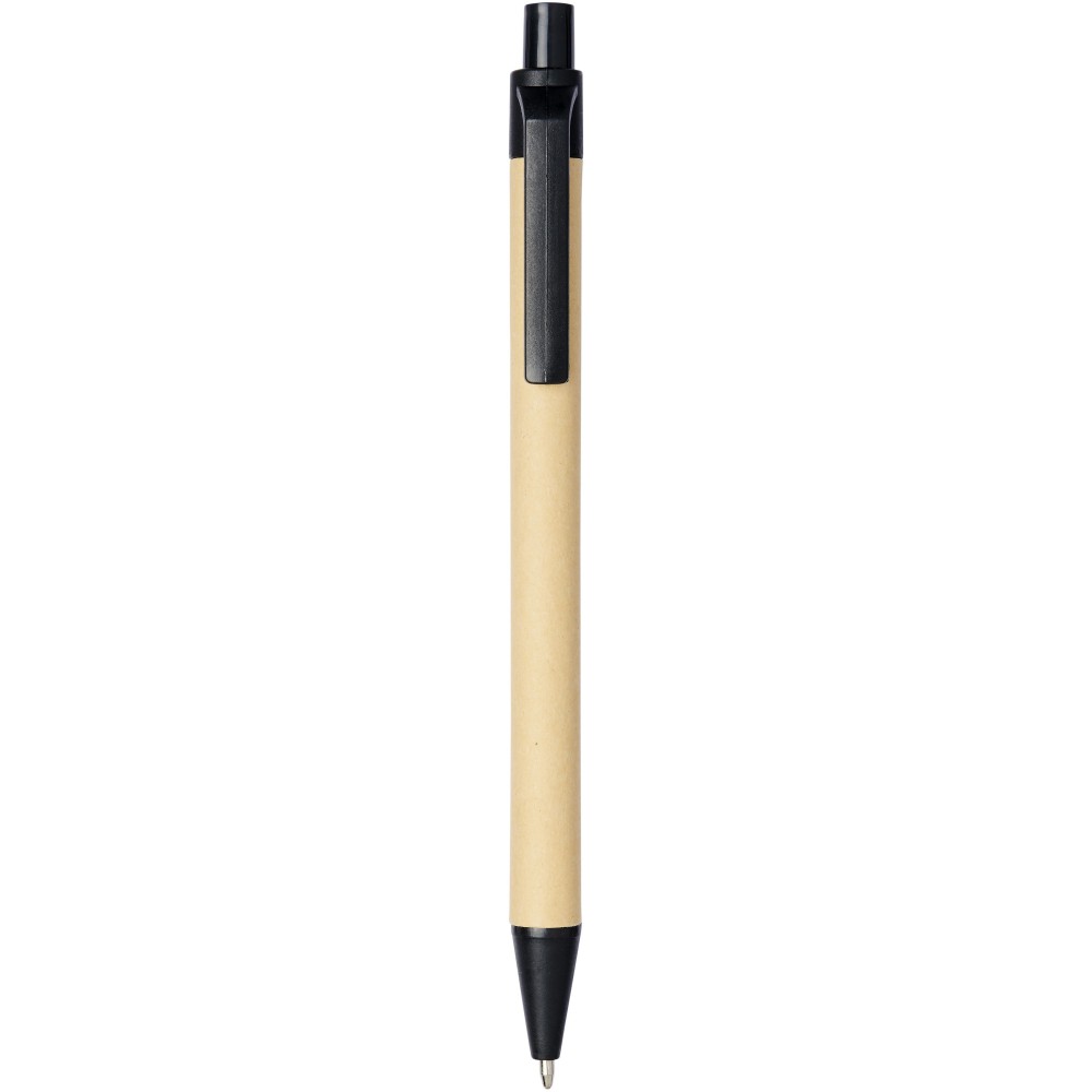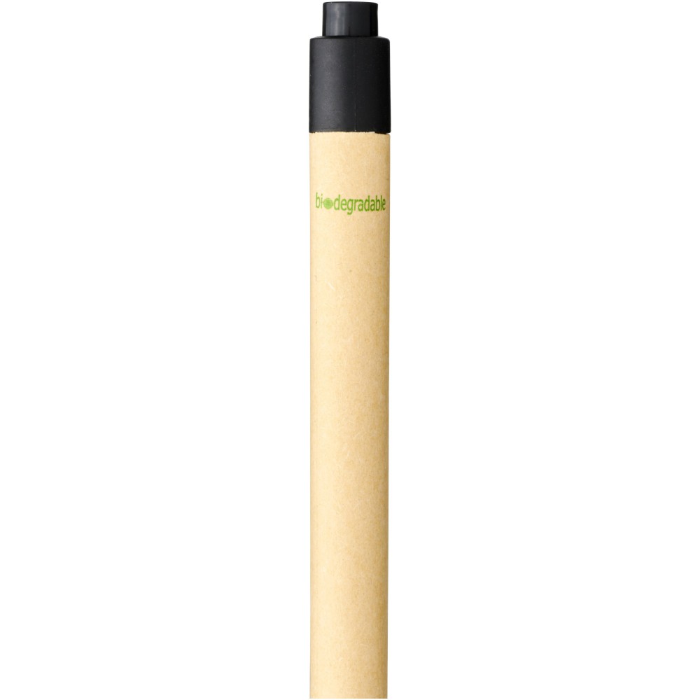 Környezetbarát golyóstoll fekete tollbetéttel, nyomógombos mechanizmussal, biológiailag lebomló papíranyagból készült tolltest és kukorica műanyag kiegészítők. Az újrahasznosított kartondoboz színe nem egységes.