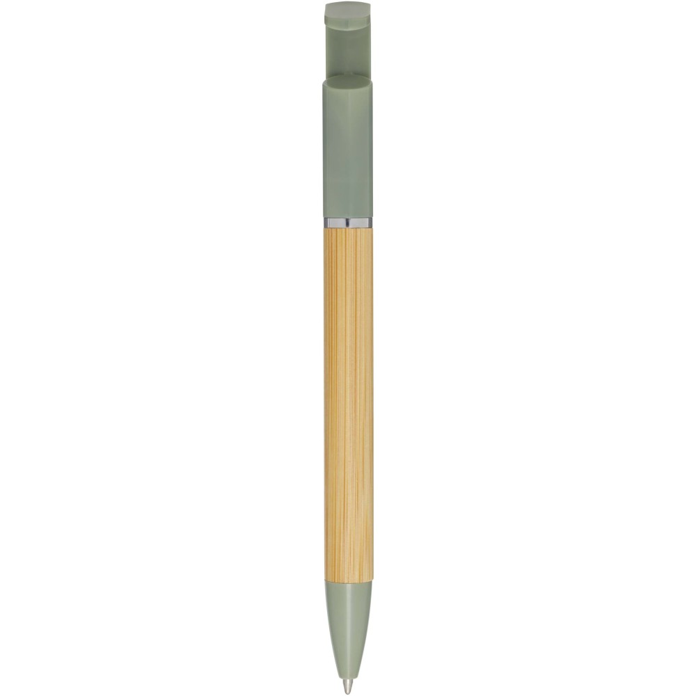 Bambusz golyóstoll, amely telefontartóként is funkcionál. A gomb és a középső gyűrű újrahasznosított műanyagból, a hegy rézből, a tollteste pedig felelősen beszerzett bambuszból készült. Kék tollbetéttel. Írási hossz: 1000 méter. Tollhegy mérete: 1,0 mm.