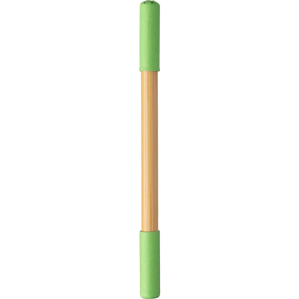 Bambusz végtelenített ceruza és golyóstoll. Az egyik oldalon végtelenített ceruza, a másikon golyóstoll, mindkettő színes karton kupakkal. Kék tollbetéttel.