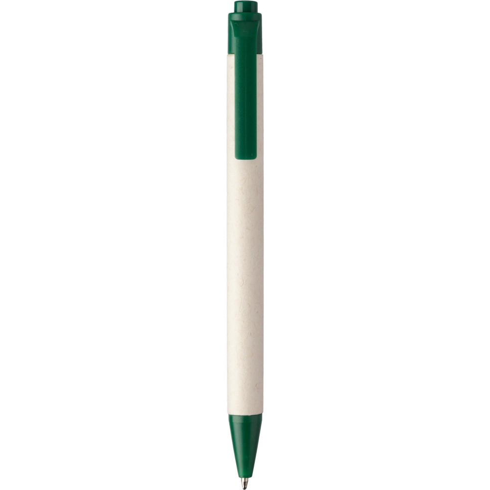 Újrahasznosított tejeskartonból készült golyóstoll újrahasznosított ABS műanyag részekkel. Újrahasznosított ABS logó és újrahasznosított tejeskarton logó jelzi a felhasznált anyagok milyenségét. Kék tollbetéttel.