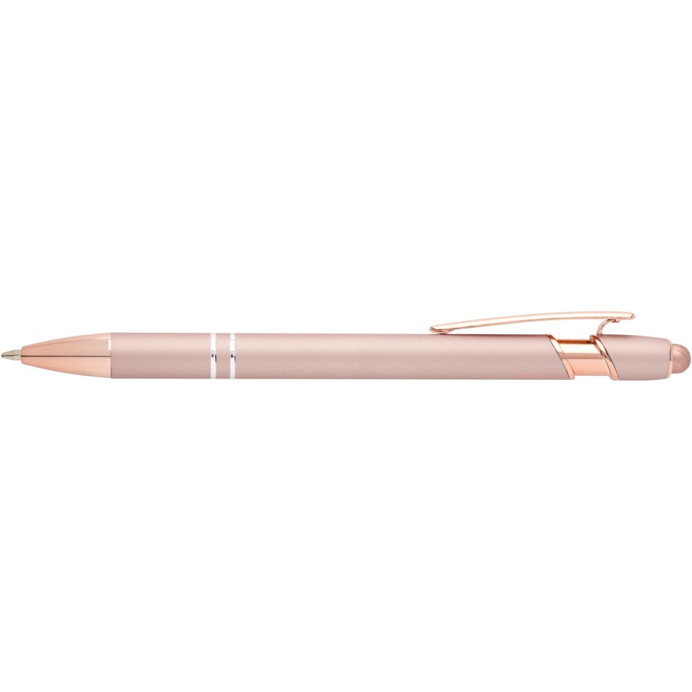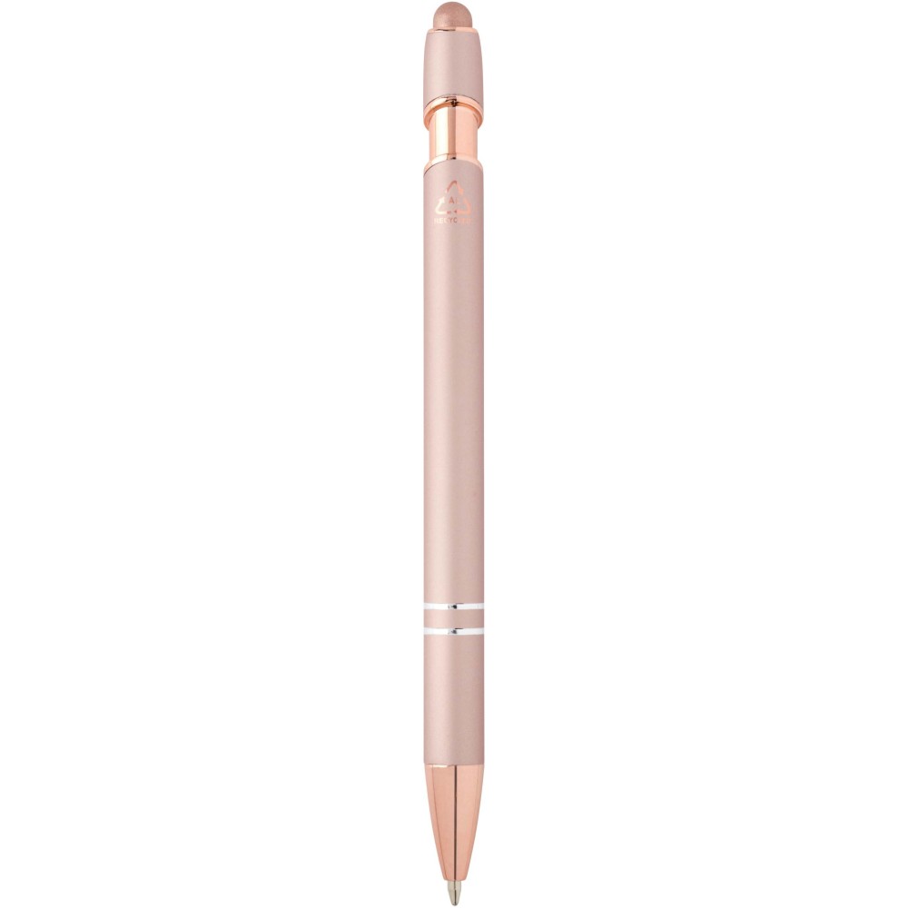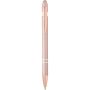 Nanna golyóstoll elegáns rózsaarany színben. A toll teste újrahasznosított alumíniumból, az érintőceruza pedig szilikonból készült, így érintőképernyős eszközökhöz is használható. Az újrahasznosított alumínium csökkenti a hulladéklerakók terhelését, segít megőrizni a természeti erőforrásokat, és célja az üvegházhatású gázok kibocsátásának mérséklése. Tinta színe: kék. Íráshossz: 800 méter. Tollhegy mérete: 1,0 mm.