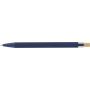 Újrahasznosított alumíniumból készült golyóstoll bambusz nyomógombbal és AS műanyag díszítéssel, fém klippel és a toll színével harmonizáló műanyag tollheggyel. A tolltesten lézergravírozott recycled (újrahasznosított) alapanyagra utaló logó található. Megközelítőleg 800 méter íráshosszúságú, kék színű tollbetéttel.