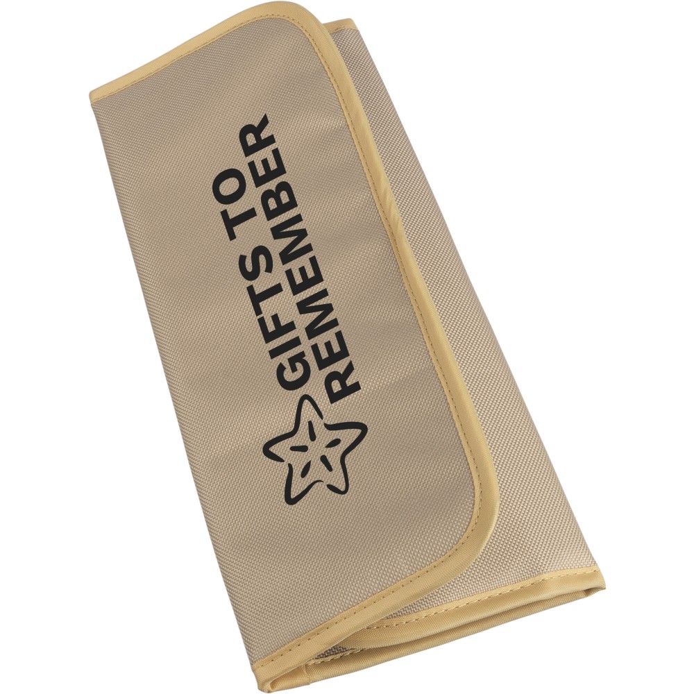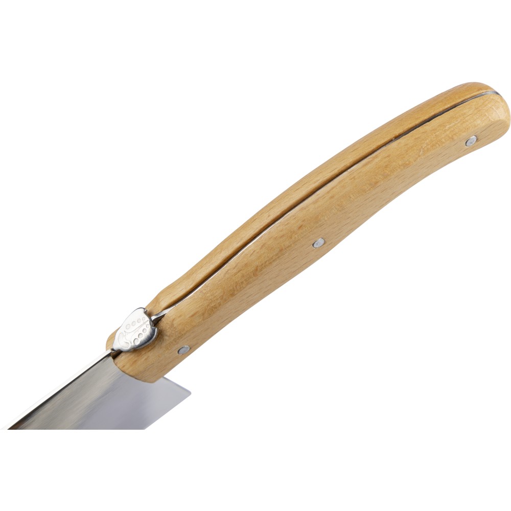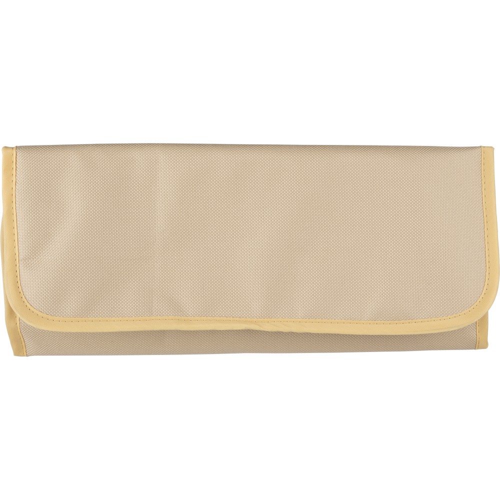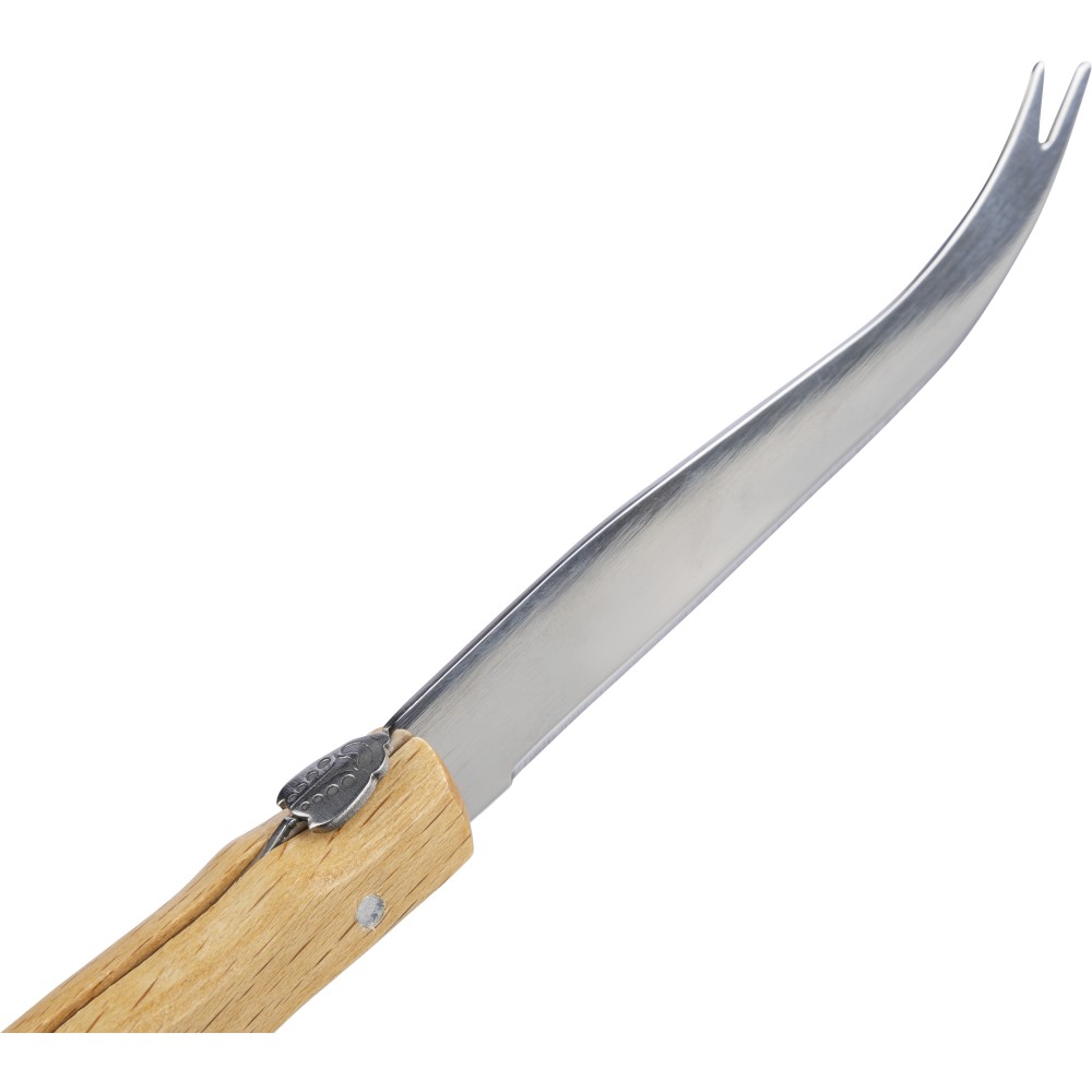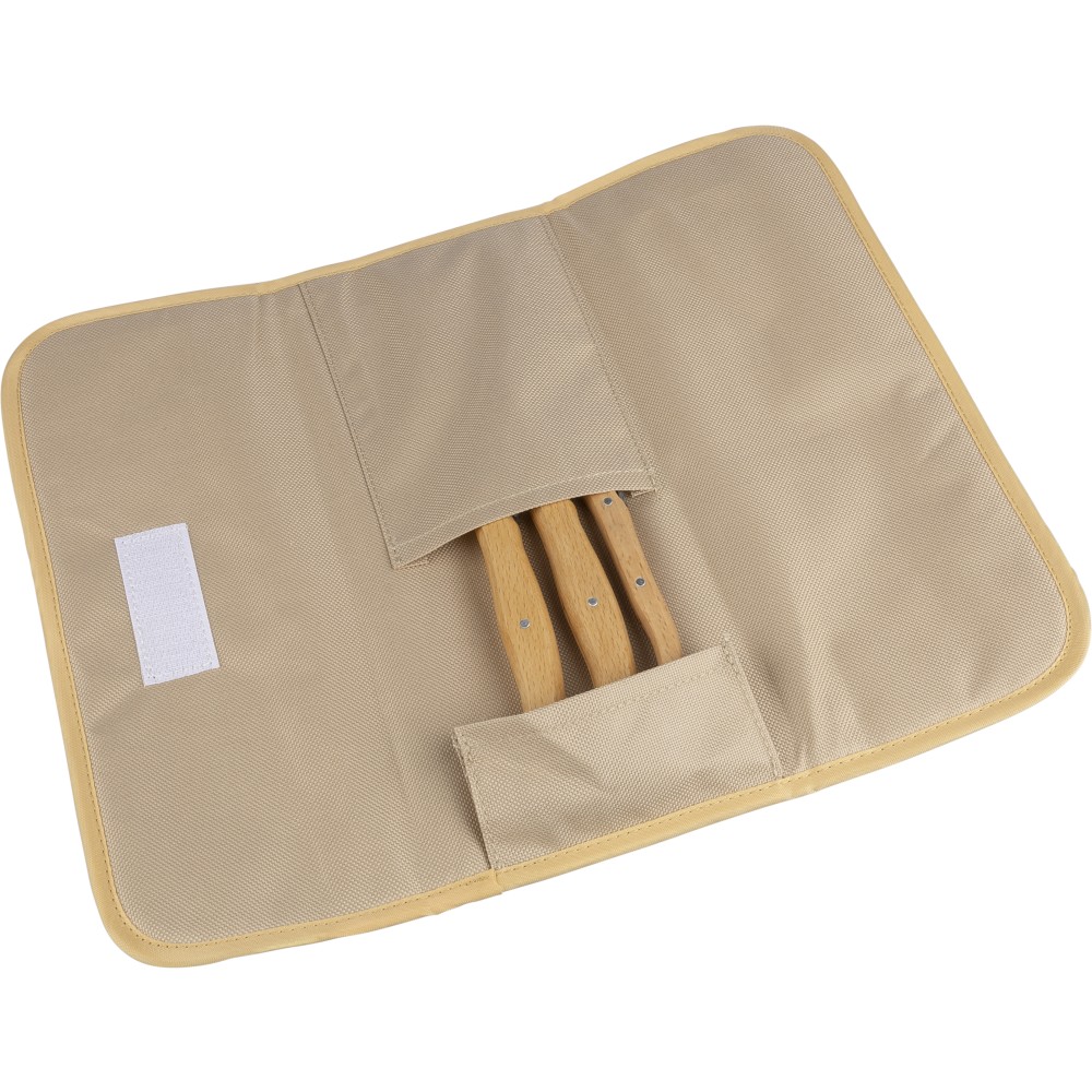 Késkészlet tépőzáras 600D rPET tartóban. 3 db fanyelű, rozsdamentes acél késsel. Belül rPET címkével. Csomagolása barna papírdoboz.