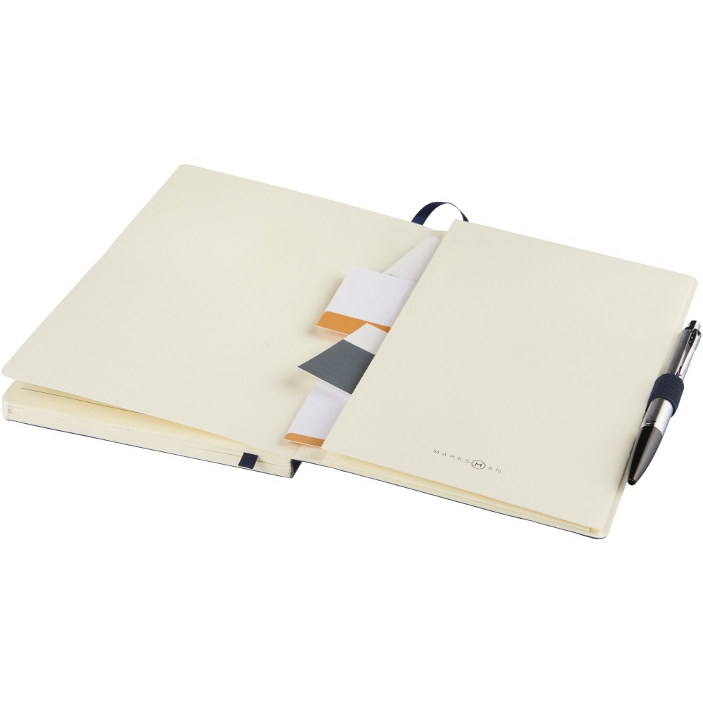 Puha borítású (A/5) jegyzetfüzet, gumis záródással, jelölővel, tolltartó hurokkal, hátoldalán zsebbel jegyzetek tárolására. 80 db krém színű vonalas (80gsm) lappal. Fekete papírhüvelybe csomagolva.