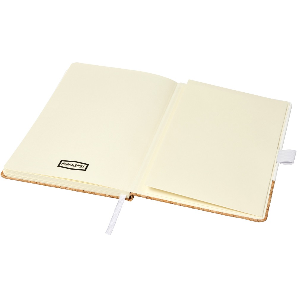 A5 méretű műbőr füzet parafa borítással, színes gumis záródással és könyvjelzővel. 80 db (80gsm) krémszínű lappal és zsebbel a hátsó, belső borítón. Csomagolás fekete dobozban.