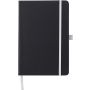 A5 füzet 96 vonalas lappal, könyvjelzővel, gumis zárópánttal. Lézergravírozás után a gravírozott felület színe megegyezik a gumipánt színével. PU anyag.