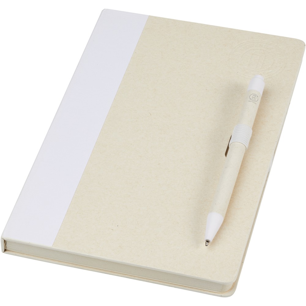 A5 méretű füzet és golyóstoll készlet. A jegyzetfüzet 80 vonalas lapot (80 g/m2) tartalmaz, amelyek újrahasznosított tejes kartondobozokból készülnek (akár 70%), színes papírgerinccel és egy tollhurokkal. A tollhurokban egy nyomógombos golyóstoll található a jegyzetfüzet színéhez illő színben. A toll teste ugyanabból az újrahasznosított anyagból készült, a gomb, a klipsz és a hegy pedig színes PLA műanyagból készült. A toll fekete tollbetéttel érkezik. A használt tejesdobozokat összegyűjtik, válogatják, feldolgozzák és papírrá alakítják, így a hulladékból hasznos termék készül.