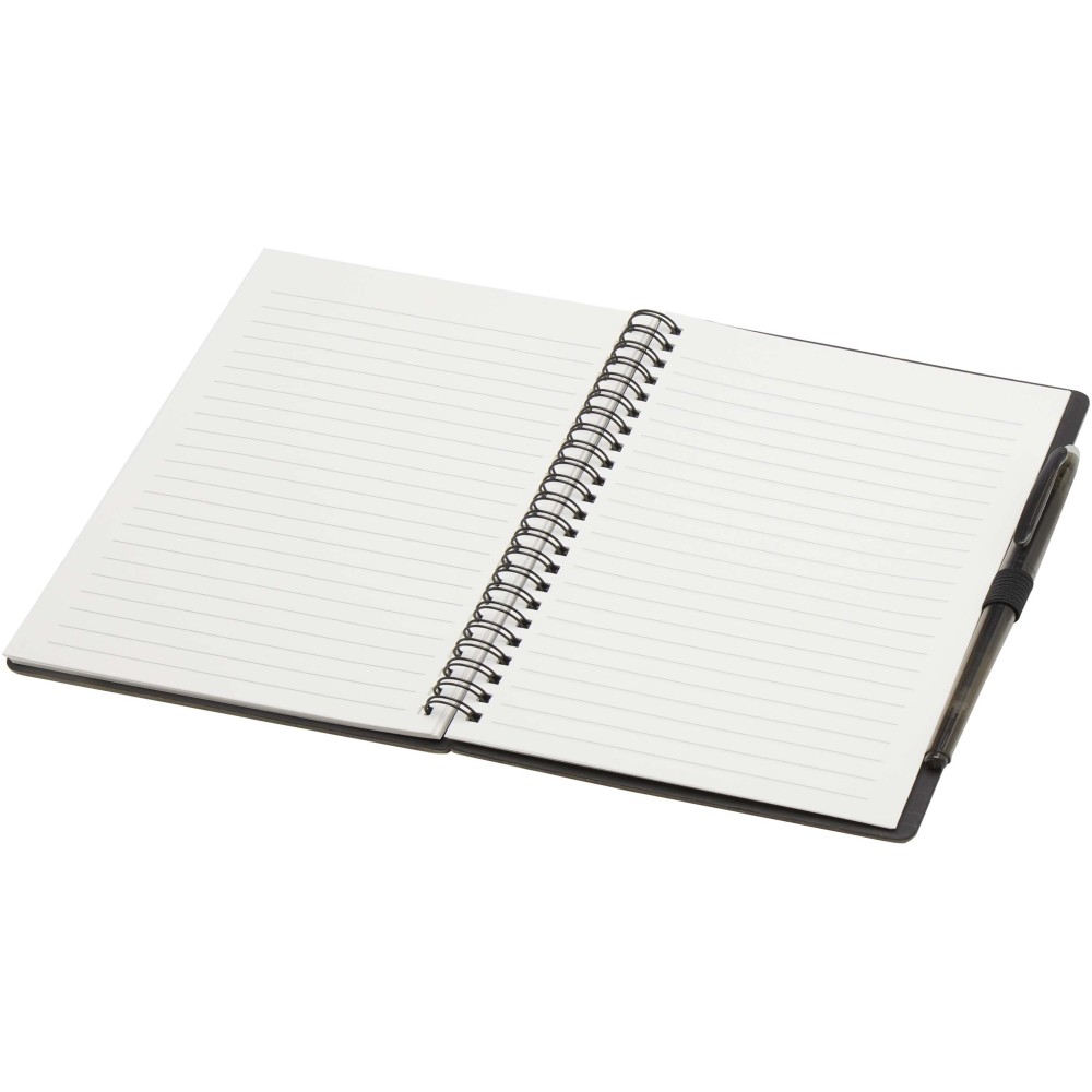 Újrahasználható, kőből készült kemény fedeles jegyzetfüzet és toll szett. A jegyzetfüzet borítója kartonból készült, lekerekített sarkokkal, és 32 lap 120 g/m2 súlyú vonalas kőpapír lapot tartalmaz. A kőpapír 100%-ban famentes, és előállítása kevesebb energiát igényel, mint az újrahasznosított vagy új cellulózpapíré. A jegyzetfüzet hátulján zseb található a mellékelt fekete törlőkendő tárolására. Tartozék továbbá egy újrahasznosított műanyagból készült törölhető toll átlátszó tolltesttel, fehér radírral a tetején, és színes, tömör fogórésszel. Tinta színe: fekete. Íráshossz: 250 méter. Tollhegy mérete: 0,7 mm.