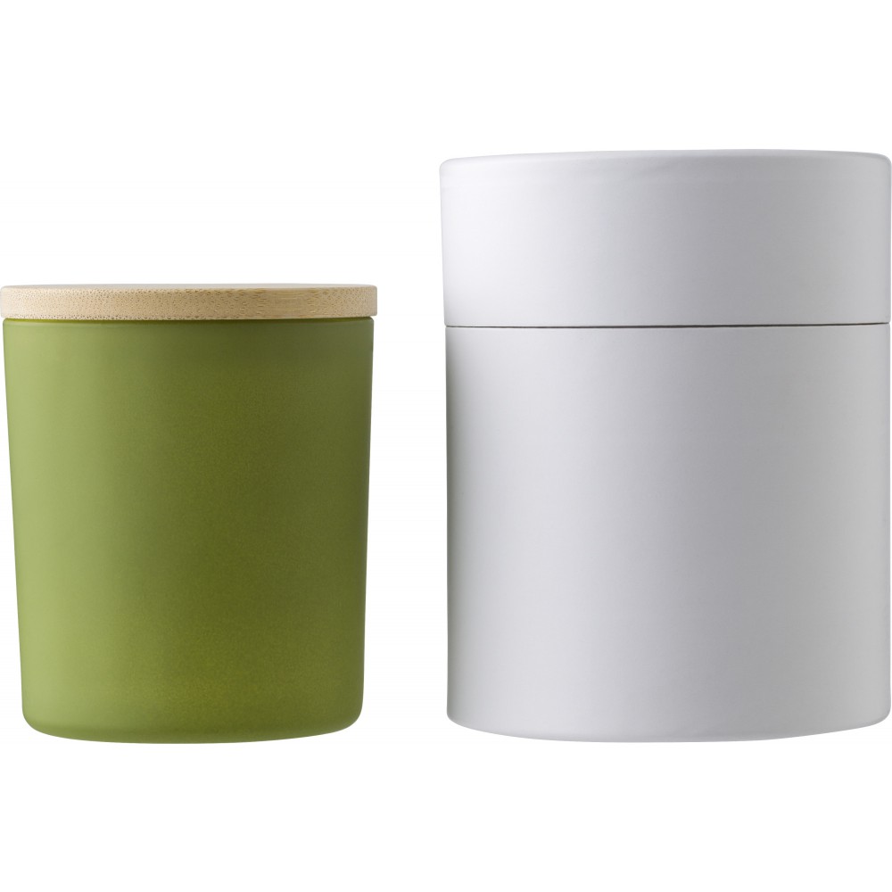 Üveggyertya növényi alapú viasszal és bambusz fedővel. A gyertya főleg növényi alapú viaszt (karnaubaviaszt) tartalmaz, égési ideje körülbelül 46 óra. Négy illat az üveg színétől függően: fahéj (piros), vanília (fehér), szantálfa (fekete) és jázmin (zöld). Egyenként, fehér papírpalástba csomagolva.