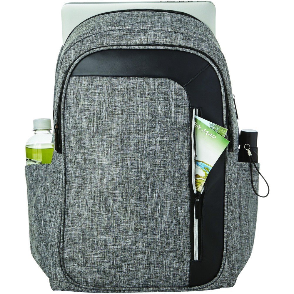 Elegáns, trendi, 15,6 -es laptop hátizsák nagy cipzáras, kulcstartós első zsebbel és rejtett RFID technológiájú blokkoló zsebbel a kártyák és okmányok adatlopás elleni védelme érdekében. A nagy, cipzáras fő tárolórész 15,6 -es laptop tárolására alkalmas, és elkölönített, párnázott résszel rendelkezik iPad vagy tablet számára. Az első, függőleges cipzár nyújt hozzáférést az első zsebhez. Két kiegészítő oldalzseb további tárolási lehetőséget biztosít, a párnázott, állítható vállpántok kényelmes viseletet nyújtanak, a hordozófül és a gurulós bőröndre húzható zseb lehetővé teszi a könnyű hordozást.