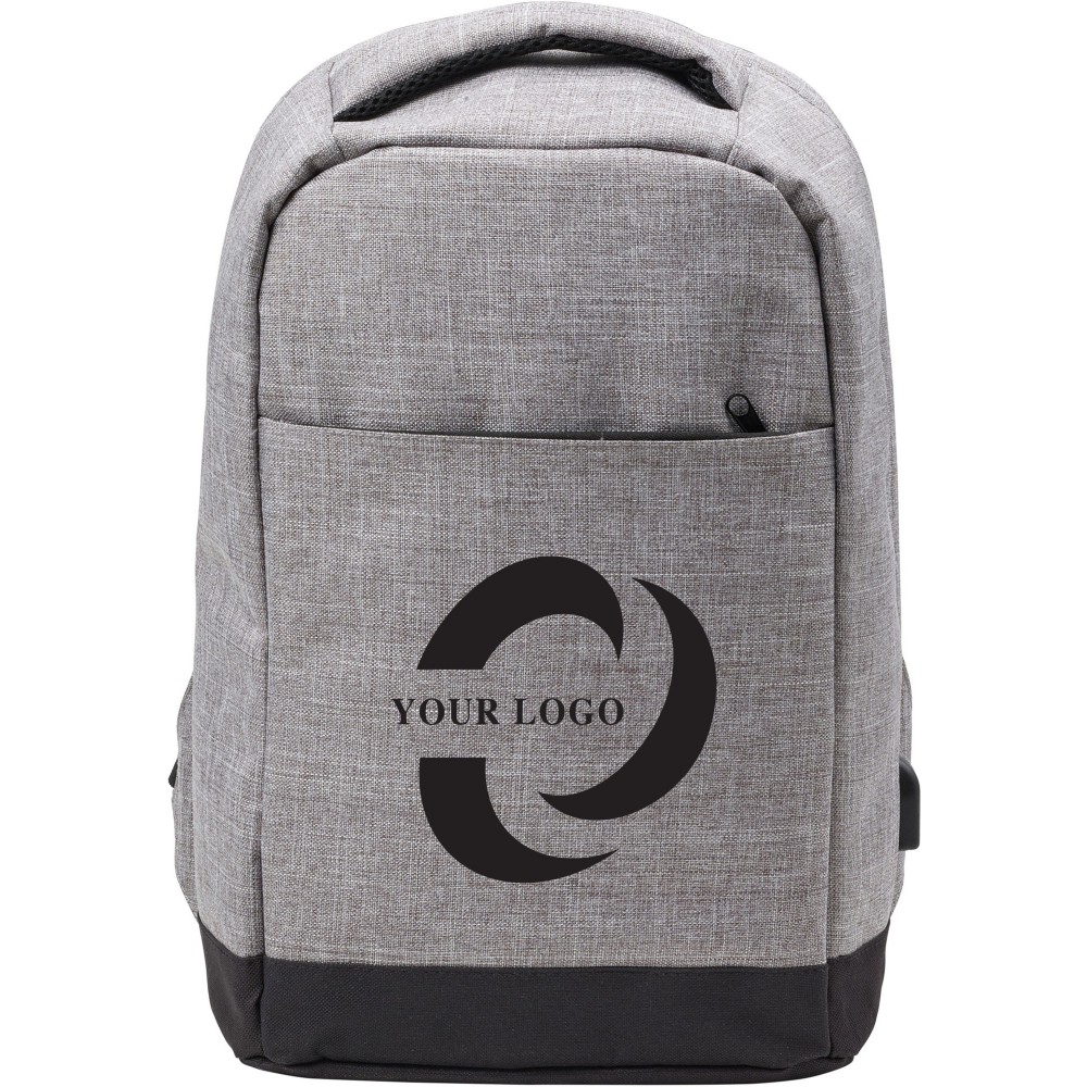 Hátizsák lopás elleni védelemmel, laptoptartóval, sok belső zsebbel, külső cipzáros zsebbel és az oldalán USB csatlakozással. 600D poliészter és PVC hátoldal. 13"-es laptop fér bele.