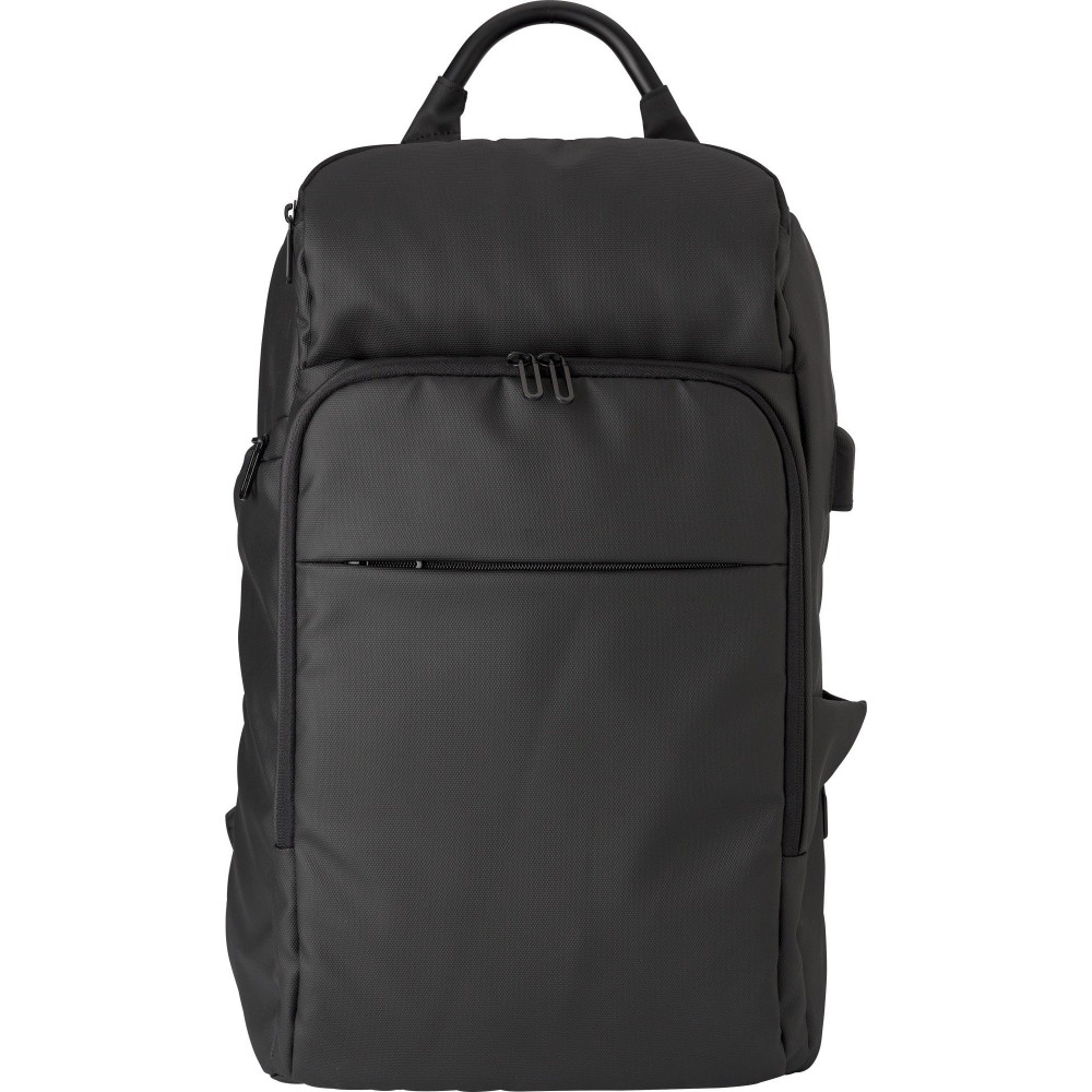 Hátizsák párnázott laptop rekesszel 15"-es laptop számára, USB porttal és vezetékkel, könnyített súlyelosztást biztosító kialakítással. Párnázott hátrész és állítható vállpánt, alumínium fóliával bélelt oldalzseb. 600D PU anyag.