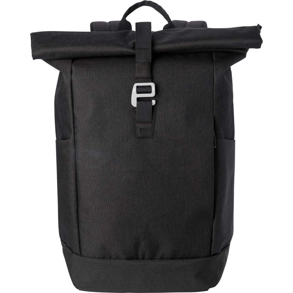 Poliészter (600D) rolltop hátizsák. Egy nagy cipzáras rekesz két csúszózsebbel és egy laptop rekesszel. Cipzáras rekesz elöl. Párnázott hátoldal és pántok. Fémhorog a záráshoz.