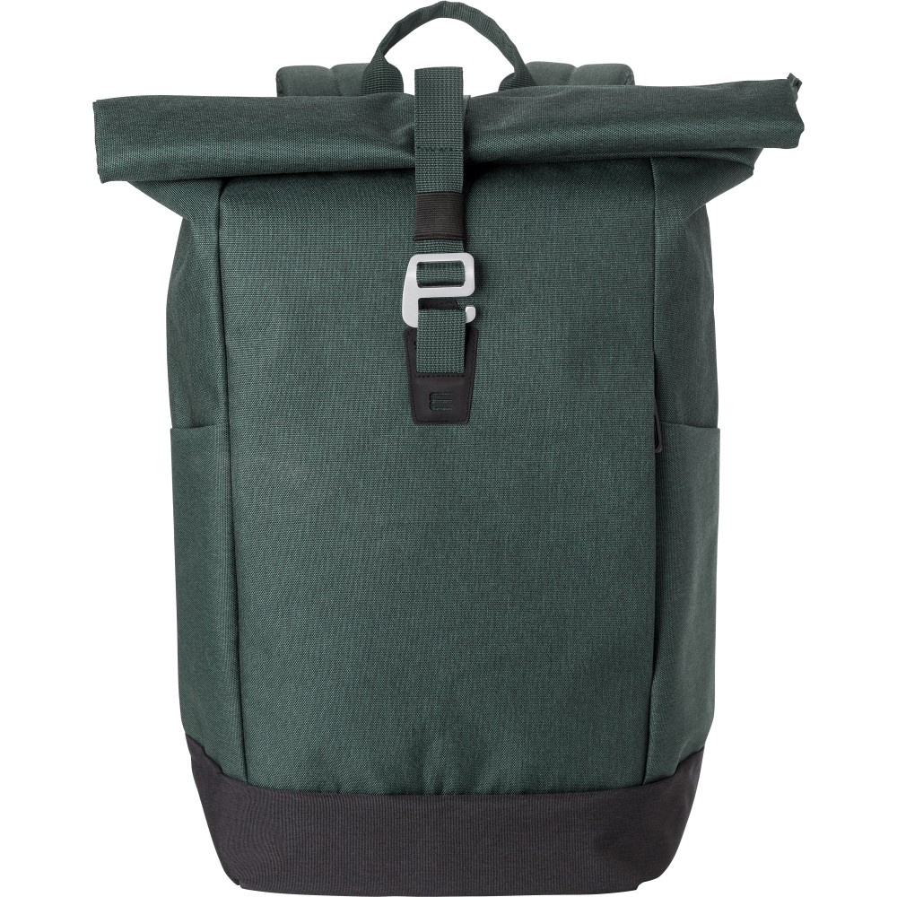 Poliészter (600D) rolltop hátizsák. Egy nagy cipzáras rekesz két csúszózsebbel és egy laptop rekesszel. Cipzáras rekesz elöl. Párnázott hátoldal és pántok. Fémhorog a záráshoz.