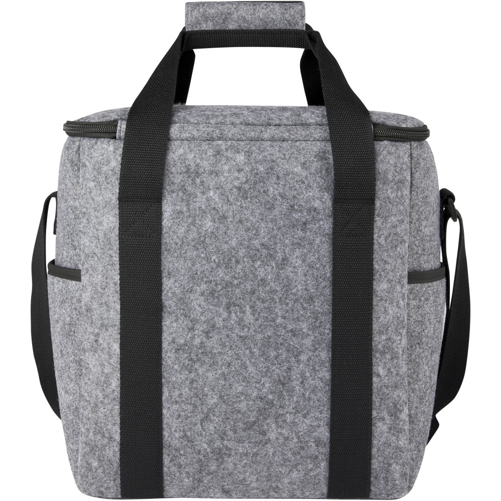 Nagyméretű hűtőtáska kiváló minőségű puha és tartós, GRS tanúsítvánnyal rendelkező újrahasznosított filcből. Tartalmaz egy nagy fő rekesszel (hat 1,5 literes palack), amely élelmiszer-biztonságos és extra vastag, nagy sűrűségű PEVA hőszigeteléssel van bélelve, amely órákon át hidegen tartja az italokat és a frissítőket. Felső cipzáras záródás, elülső zseb és két oldalsó zseb extra tároláshoz. Állítható hosszú pamut szőtt vállpántok (55 x 3,8 cm) és 2 szőtt pamut fogantyú (25 x 3,8 cm), felső kampóval és hurokkal zárható. Könnyen tisztítható. Űrtartalom: 21 liter. GRS tanúsítvánnyal rendelkező újrahasznosított poliészter.