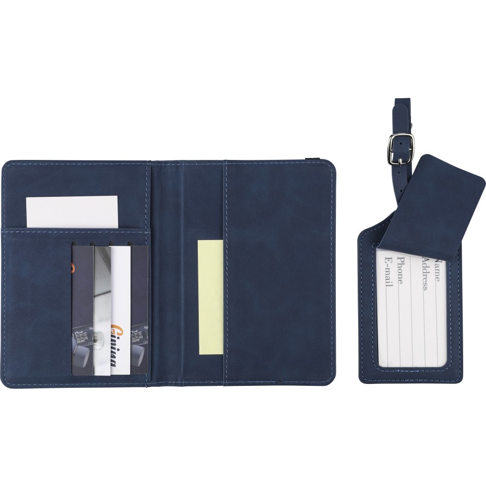Újrahasznosított PU anyagból készült útlevéltartó és poggyászcímke, illusztrációval ellátott barna kartondobozban. Az útlevéltartó elülső oldalán "Passport" felirat található, belül két rekesszel az útlevél biztonságos rögzítéséhez. Mindkét terméken dombornyomott, újrahasznosított alapanyagra utaló logó található.