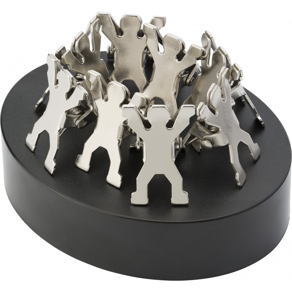 Fekete, ovális papírnehezék mágnessel, ezüst színű, ember alakú iratcsipeszekkel. 8 csiptető tartozék