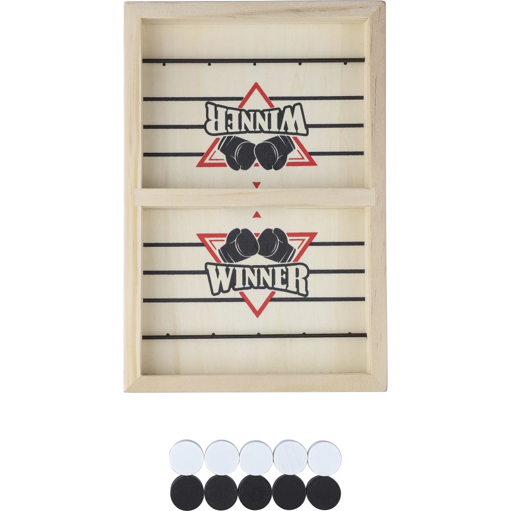 Tartalma 10 db korong (5 db fekete, 5 db fehér) és egy játékszabály. Gyorsan elsajátítható játék gyerekek és felnőttek számára. A flipperre és a gombfocira emlékeztető játék, amire sling puck néven keresve több videót találhattok. Csomagolása illusztrált barna papírdoboz.