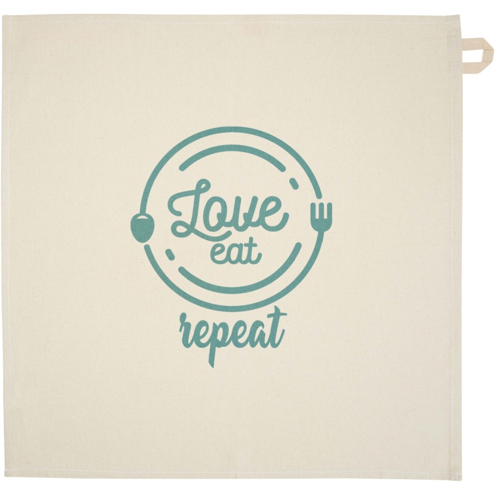 Konyharuha 100% GRS tanúsítvánnyal, 200 g/m2 újrahasznosított pamutból készült, és jellegzetes kontrasztos akasztóval rendelkezik. Mérete: 50 x 50 cm.