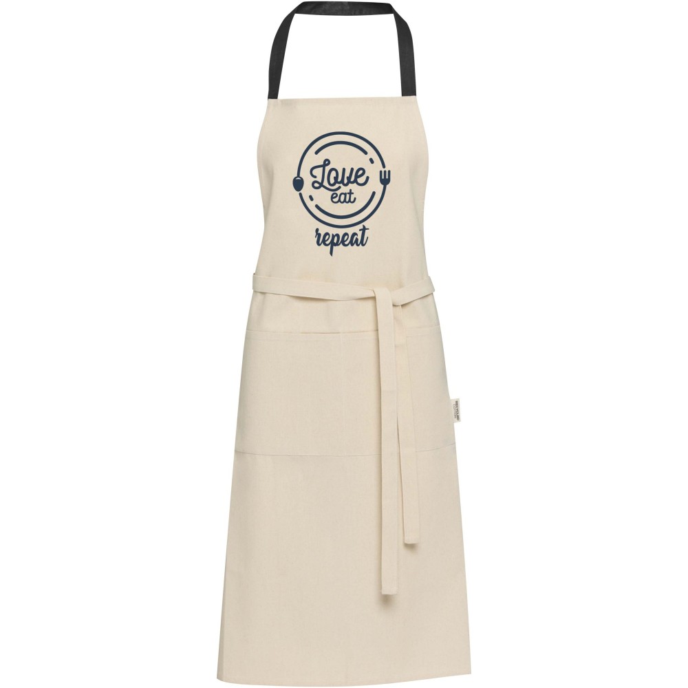 A Nia kötény 100% GRS tanúsítvánnyal rendelkező, 200 g/m2 újrahasznosított pamutból készült. Természetes pamut színe és kontrasztos nyakkpántja elegánsan védi ruhádat főzés közben. Két egymás melletti zsebbel rendelkezik, összesen 45 x 20 cm-es mérettel, és 1 méter hosszú pánttal rögzíthető hátul.