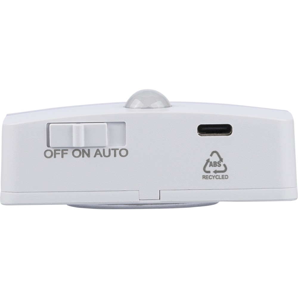 Újrahasznosított ABS és PC anyagból készült érzékelős lámpa 30 lumen fényerővel, 120 fokos mozgásérzékeléssel (3-6 m hatótávolság) és fényérzékelővel. USB-C csatlakozón keresztül újratölthető, 500 mAh kapacitású akkumulátorral. Hátoldalán mágnes, ragasztóval ellátott fémlemez és akasztónyílás található. A töltőcsatlakozó alatt gravírozott recycled (újrahasznosított) alapanyagra utaló logó található. Illusztrációval ellátott barna kartondobozba csomagolva.