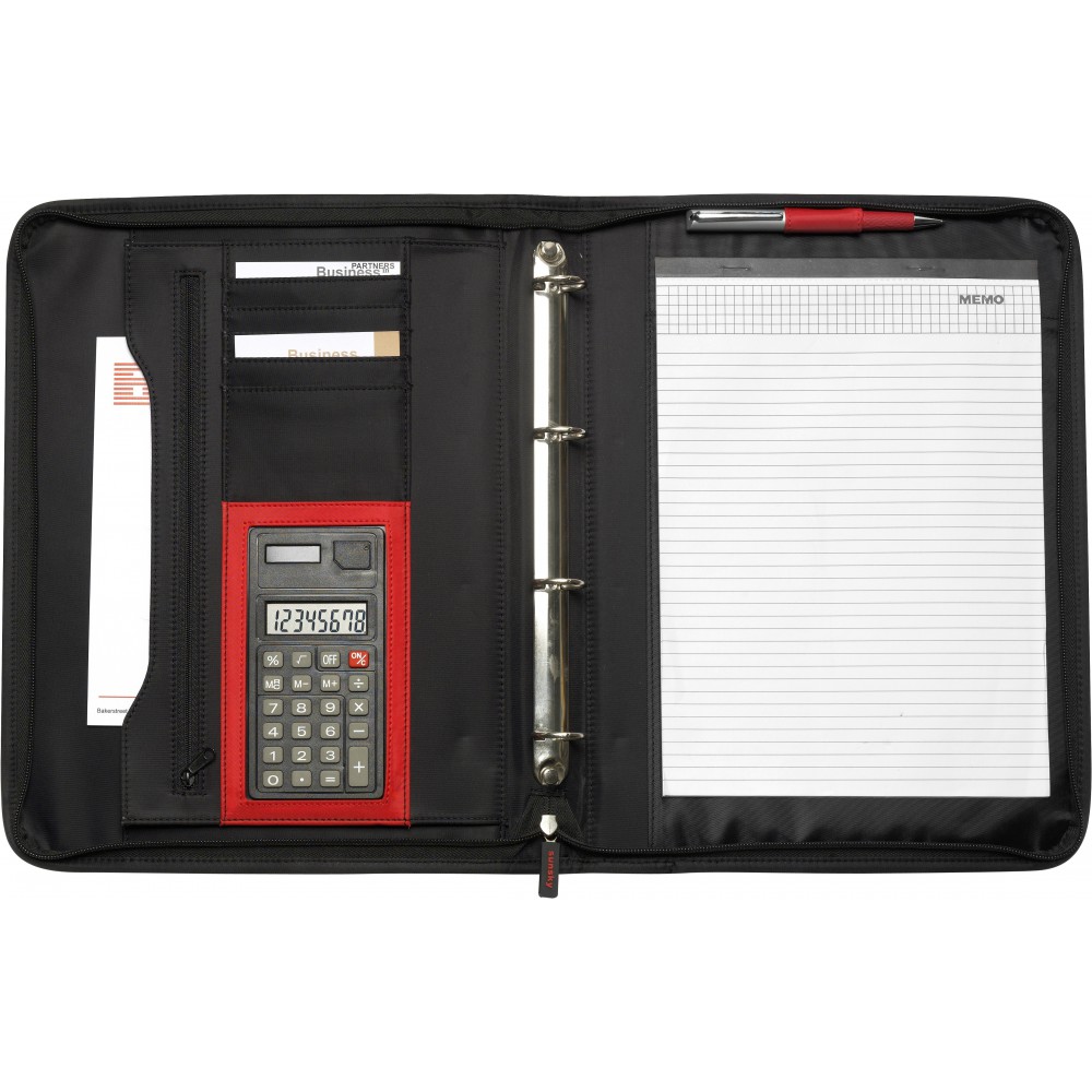 A4-es cipzáras, gyűrűs mappa 8 karakteres számológéppel, 20 lapos jegyzettömbbel. Napelemmel és elemmel is működik. 70D nylon.
