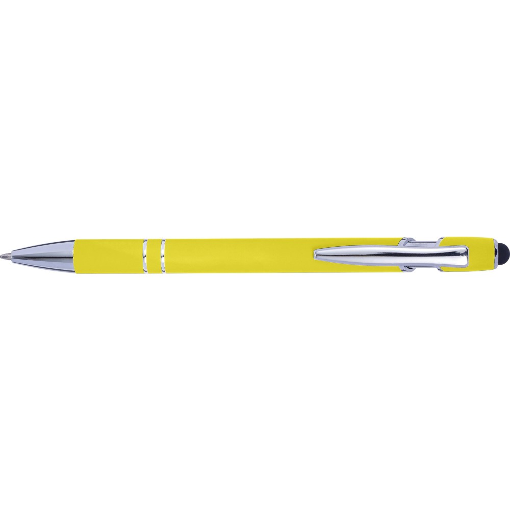 Golyóstoll kék tollbetéttel, gumis felülettel és érintővel kapacitív képernyőkhöz. Kék tollbetéttel. A hegy és a klipsz ezüst színű műanyag. ABS, alumínium.