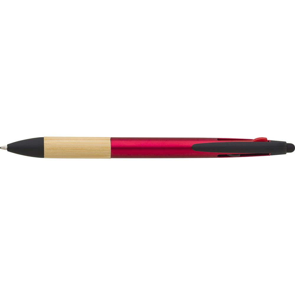 Golyóstoll 3 féle tollbetéttel, bambusz markolattal és tollheggyel. A tollbetét színei: piros, kék, fekete. ABS műanyag.