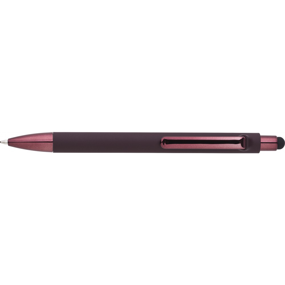 Golyóstoll gumis bevonattal és UV színű részletekkel, érintővel, kék tollbetéttel. ABS, PP műanyag, szilikon, vas.