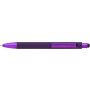 Golyóstoll gumis bevonattal és UV színű részletekkel, érintővel, kék tollbetéttel. ABS, PP műanyag, szilikon, vas.