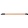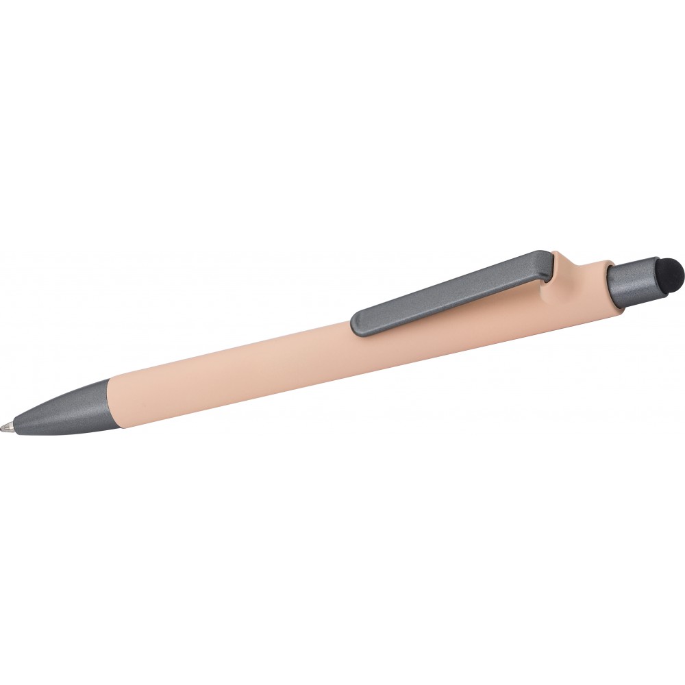 Golyóstoll gumis bevonattal, érintővel, kék tollbetéttel. ABS, PP műanyag, szilikon, vas.