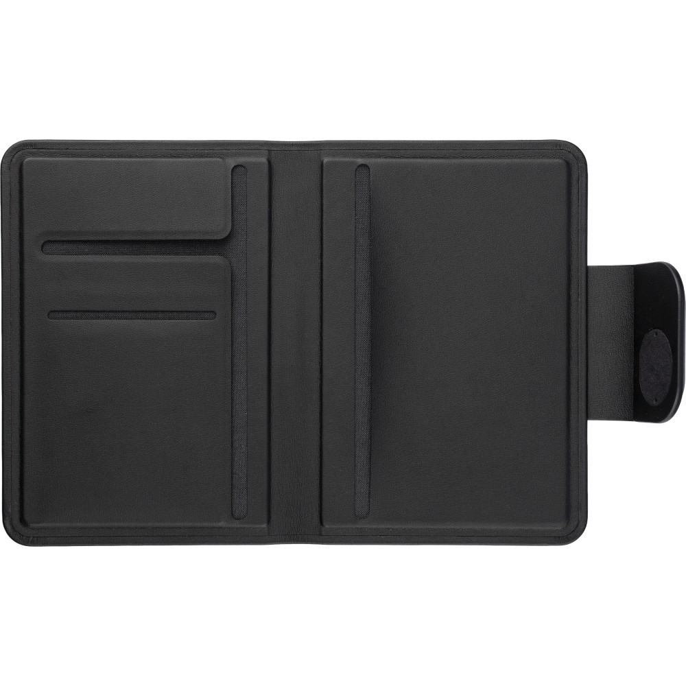 Újrahasznosított PU anyagból készült keményfedeles útlevéltartó mágneses záródással és a zárófülbe ágyazott, beépített Apple FindMy nyomkövetővel. Három belső tárolórésszel az iratok és kártyák rendszerezéséért. Csomagolása kraftpapír doboz.
