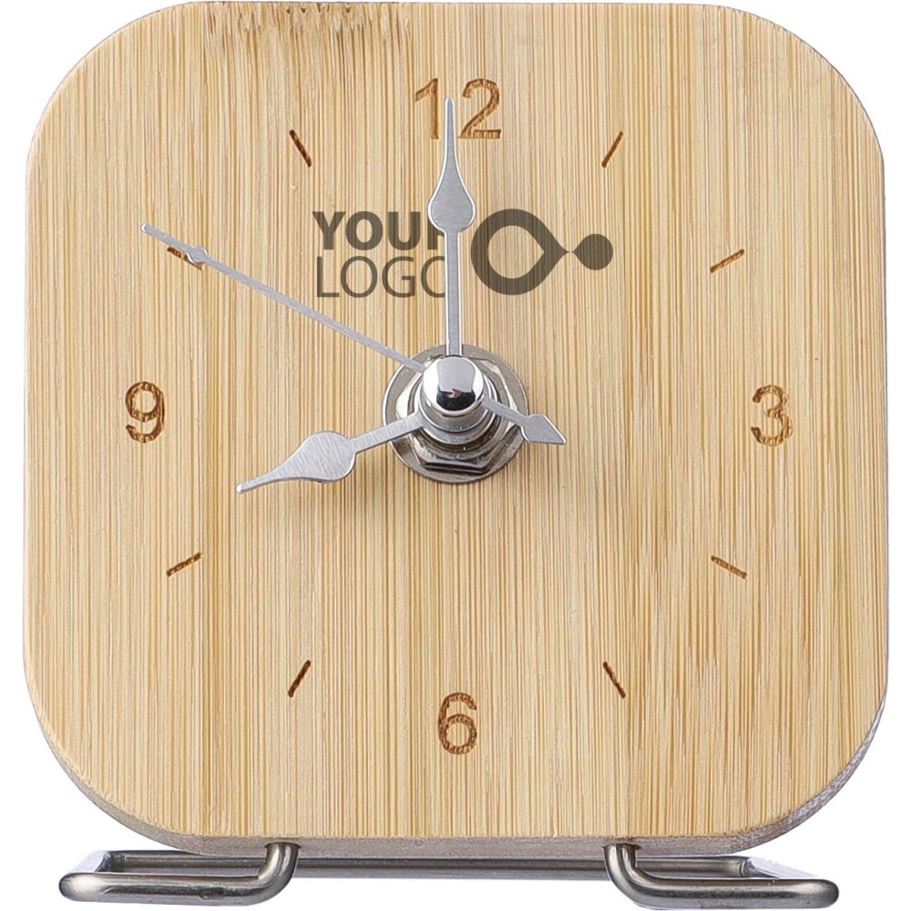 Bambusz óra ezüst mutatókkal és állvánnyal. Elem mellékelve. Egyenként barna kartondobozba csomagolva.