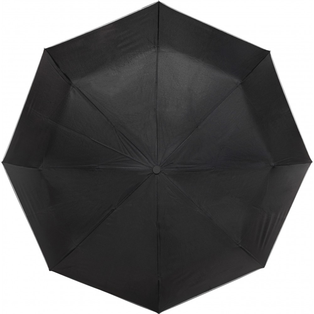 Összecsukható automata esernyő. Szélálló kialakítás, fém váz, tépőzáras összefogó pánt és tok. Nyitása és záródása is automatikus.