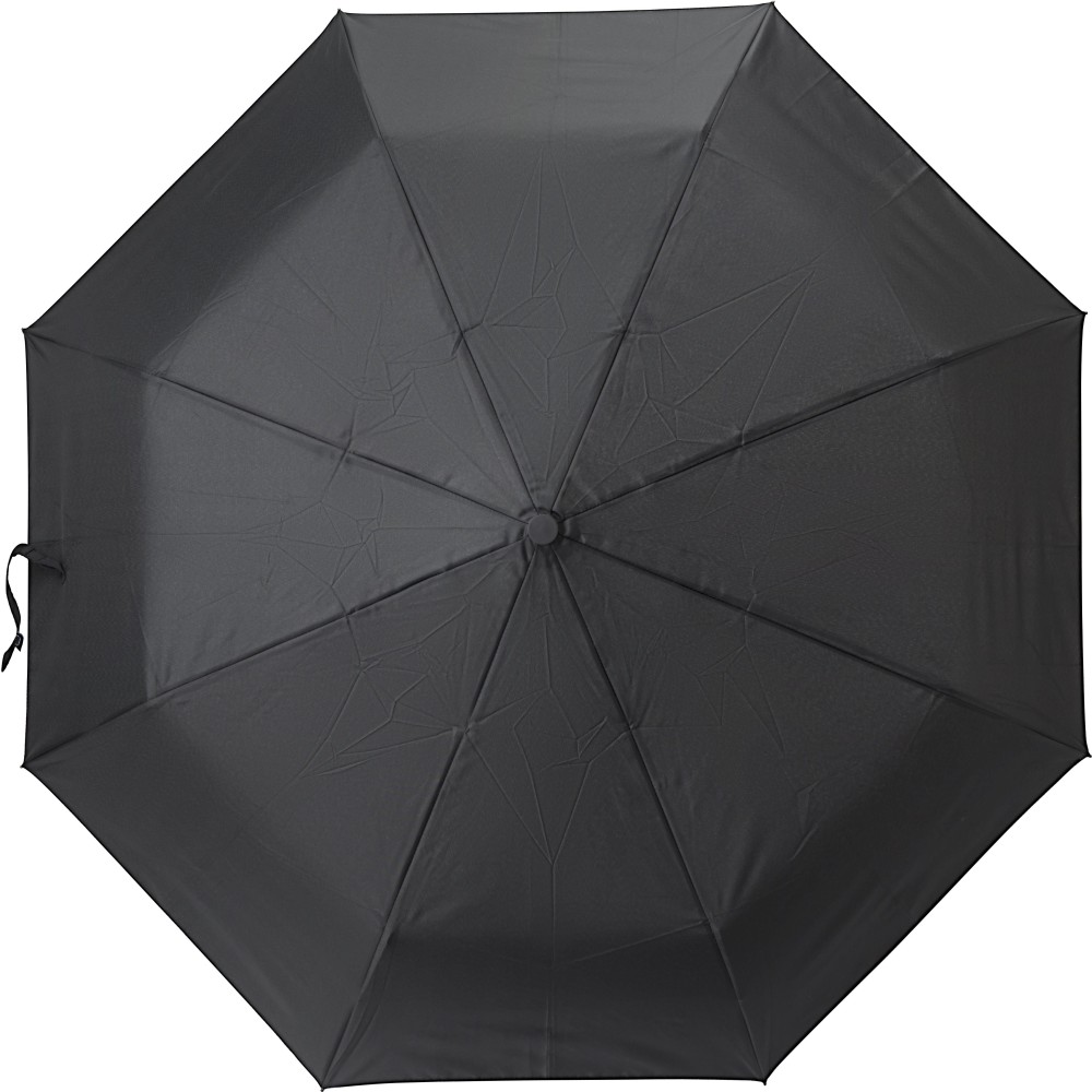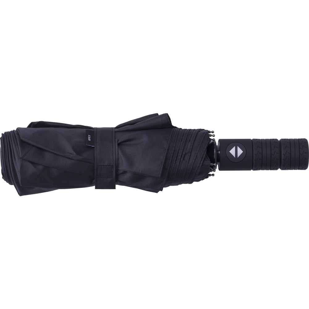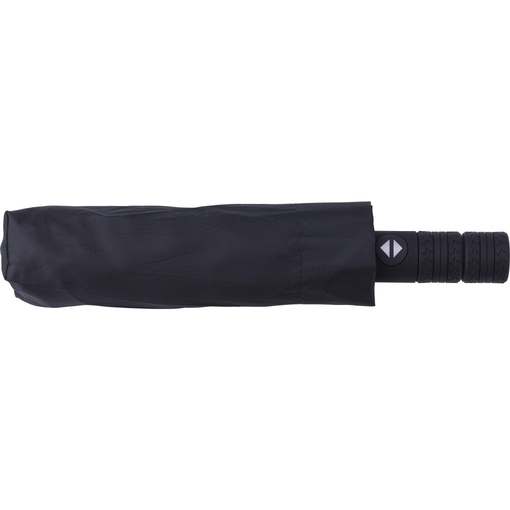 Automata nyitású és zárású, összecsukható esernyő 8 panellel, tokkal. Nyele gumis mintázatú, az autók abroncsára emlékeztet. Vászna RPET pongee anyag. Mérete: 21".