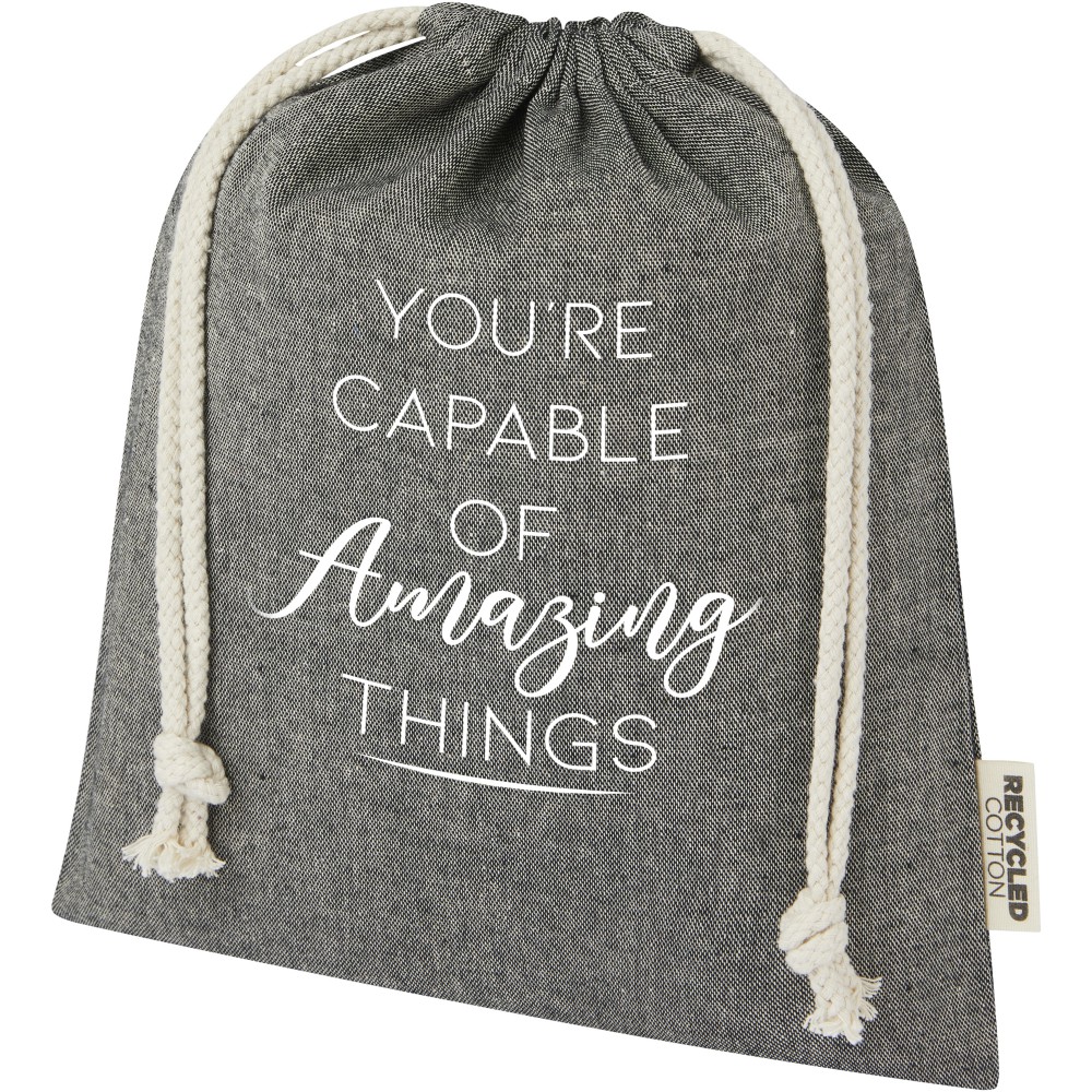 Ajándéktáska GRS tanúsítvánnyal rendelkező újrahasznosított pamutból, pamut húzózsinórral. Ideális ajándékok átadására, tárolására. Mérete: 25 x 30 cm.