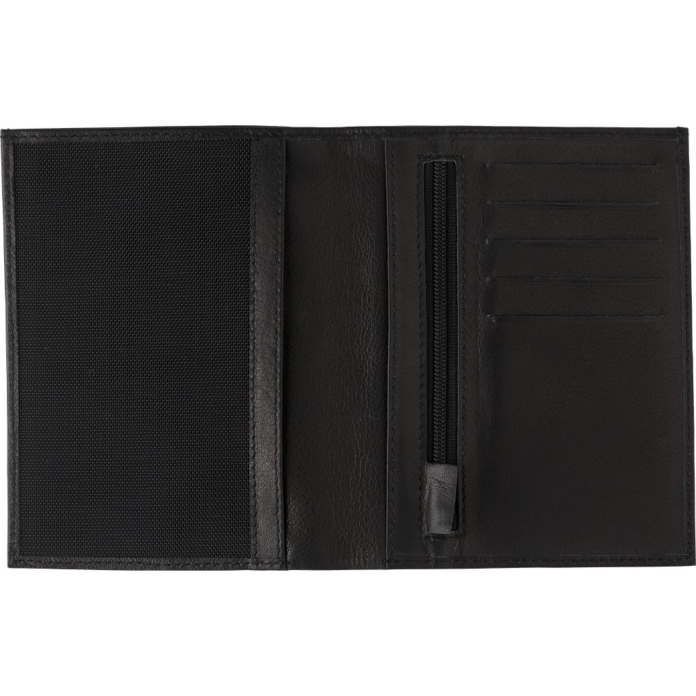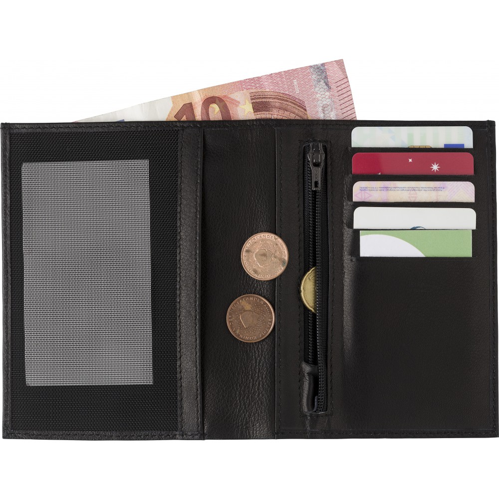 Hasított bőr kártyatartó RFID védelemmel az adatlopás ellen, cipzáros érmetartóval és több zsebbel a papírpénz és kártyák számára.