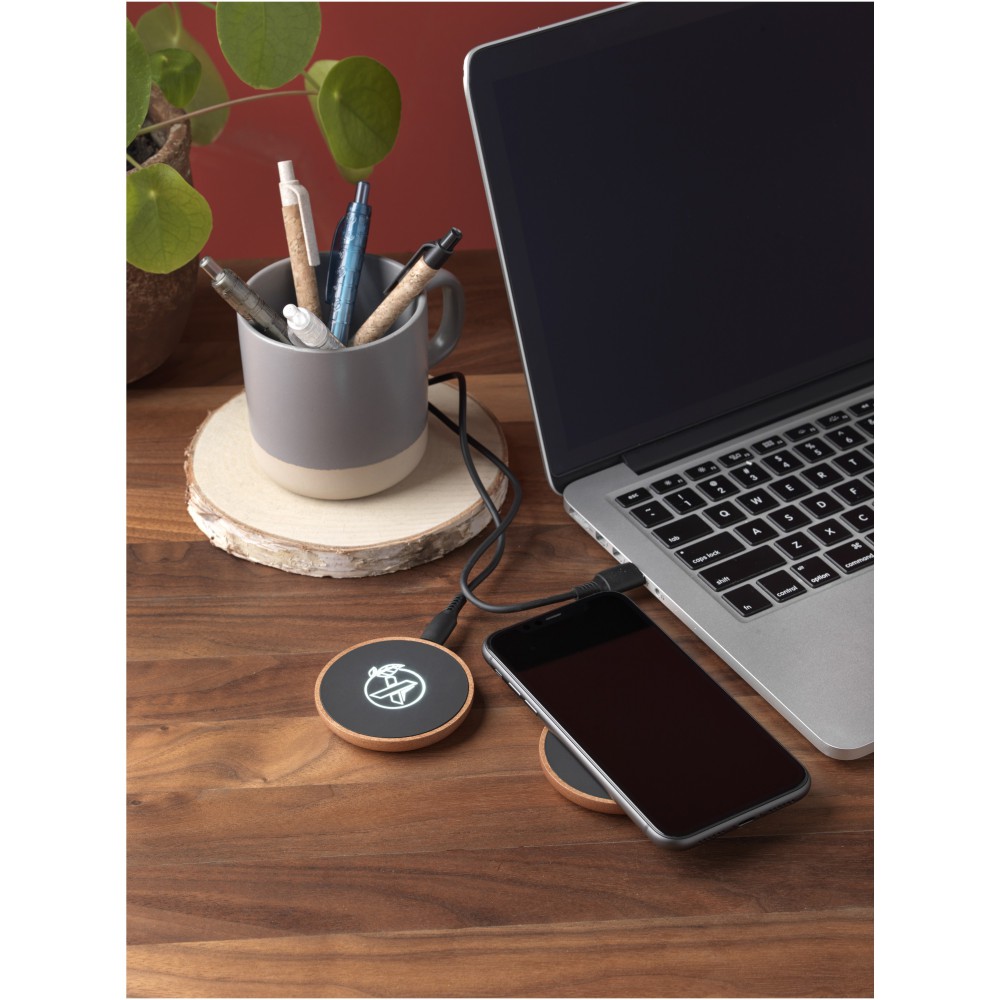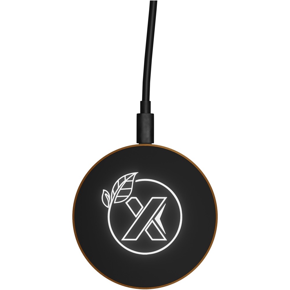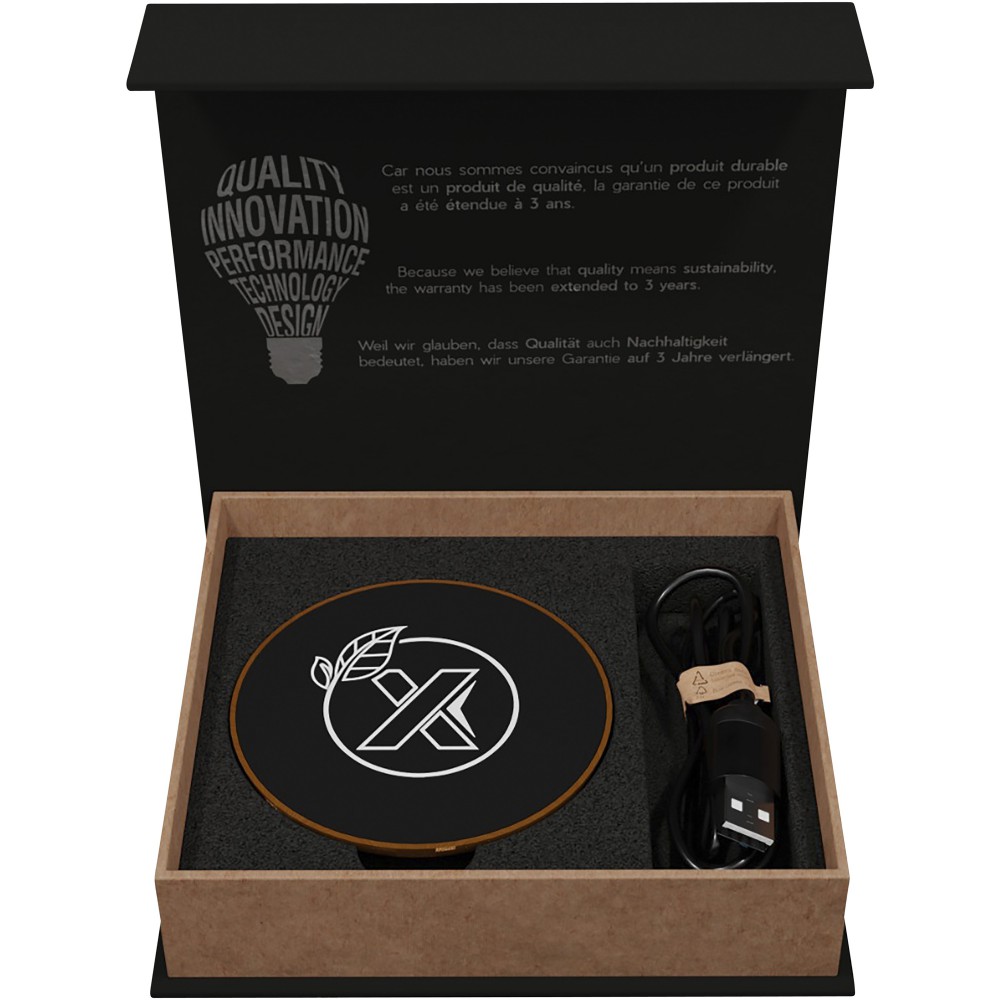 10 W-os vezeték nélküli töltőállomás gumiból és fából, valamint újrahasznosított PET műanyagból készült töltőkábel. Világító logóval emblémázható. Újrahasznosított papírból készült fekete kraft díszdobozban, mágneses zárószerkezettel szállítjuk. EUROPE EUIPO szabadalom.
