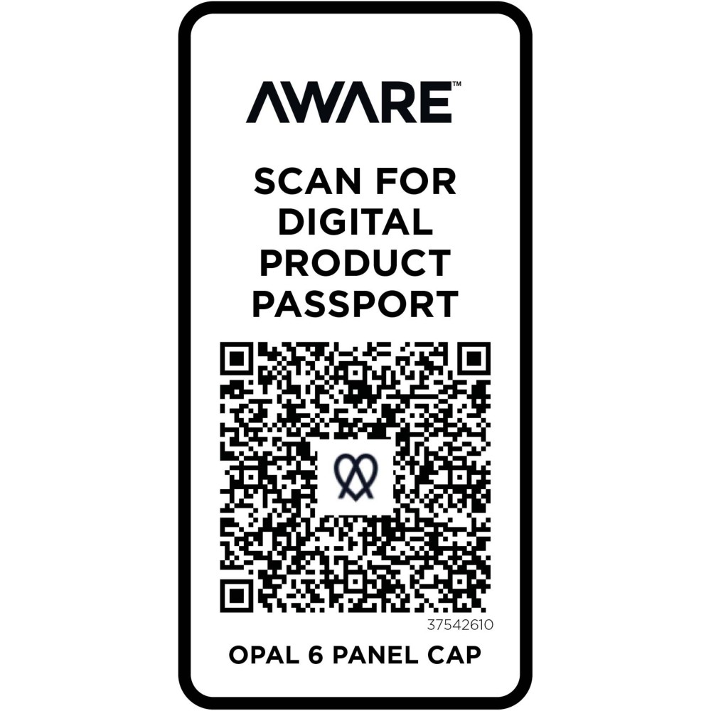 Az Opal 6 paneles sapka 70%-ban újrahasznosított pamutból és 30%-ban újrahasznosított poliészterből készült. Úgy tervezték, hogy 58 cm-es fejkörfogatnál kényelmesen illeszkedjen, a fémcsatos záródás pedig könnyű és biztonságos beállítást tesz lehetővé. A sapka Cyclo újrahasznosított szálakat tartalmaz, ahol előválogatott hulladékot használnak, amely meghatározza a fonal színét. Ezek a szálak nem csak a szűz erőforrások iránti igényt csökkentik, hanem a körkörös élet iránti elkötelezettséget is mutatják, megtestesítve a hulladékcsökkentés lényegét. Minden sapkához egy Aware nyomjelző is tartozik. Ez az innovatív funkció lehetővé teszi a felhasználók számára, hogy egy QR-kód segítségével nyomon követhessék a termék eredetét és útját, növelve az ellátási lánc átláthatóságát, és elősegítve a termék és a gyártási folyamat közötti szorosabb kapcsolatot.