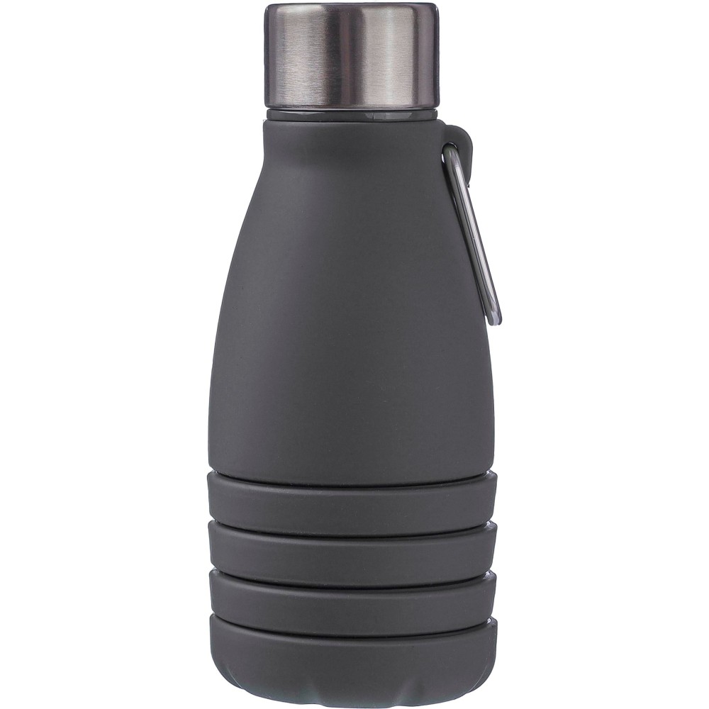 Összecsukható palack rozsdamentes acél fedéllel és alumínium karabinerrel. Összecsukott méret: d: 7x17 cm, kinyitott méret: d: 7x25 cm. Nincs egyenként csomagolva. Anyaga: szilikon. Űrtartalom: 550 ml.