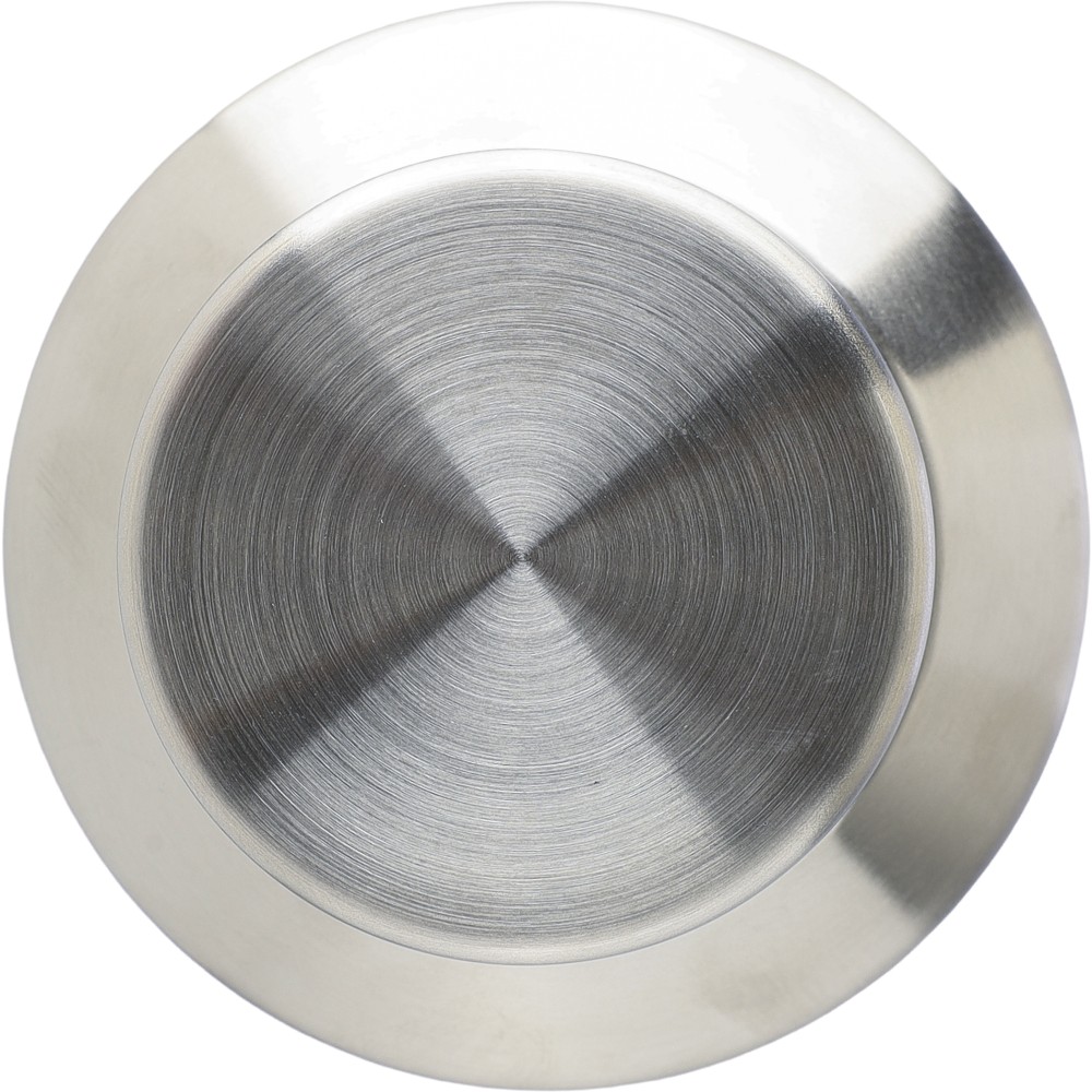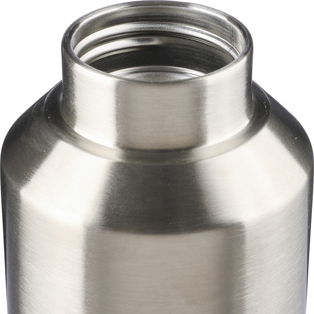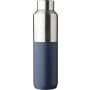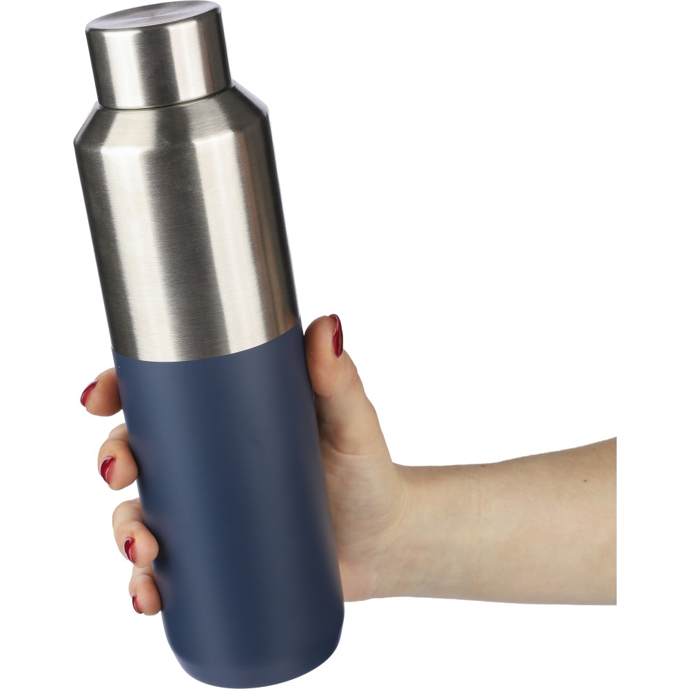 Újrahasznosított rozsdamentes acél palack, 600 ml. Duplafalú, vákuumszigetelt, a belső 304-es, a külső pedig 201-es rozsdamentes acélból készült. Kupakja PP, 201-es rozsdamentes acél külsővel. Elején gravírozott újrahasznosított logó található. Csomagolása barna papírdoboz.