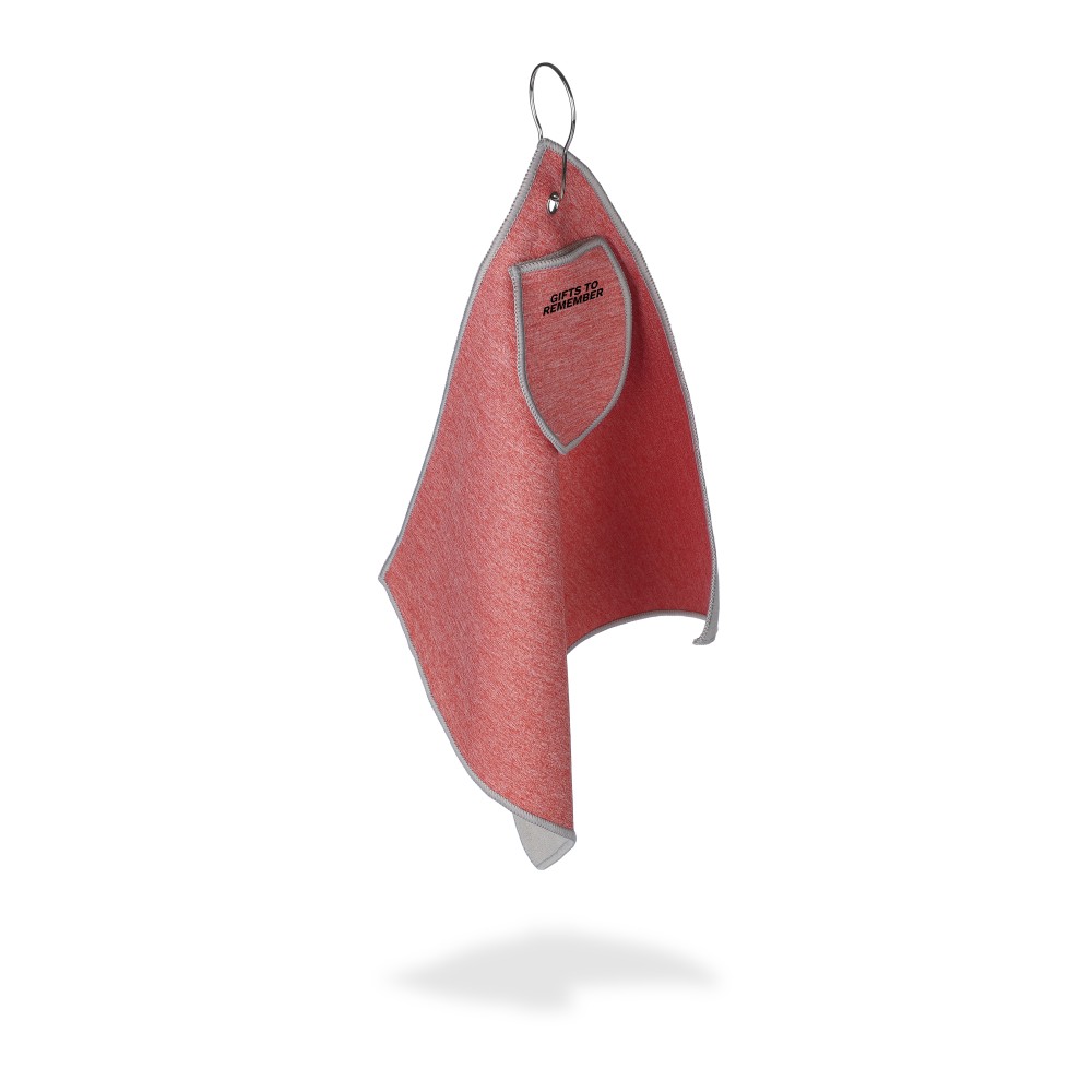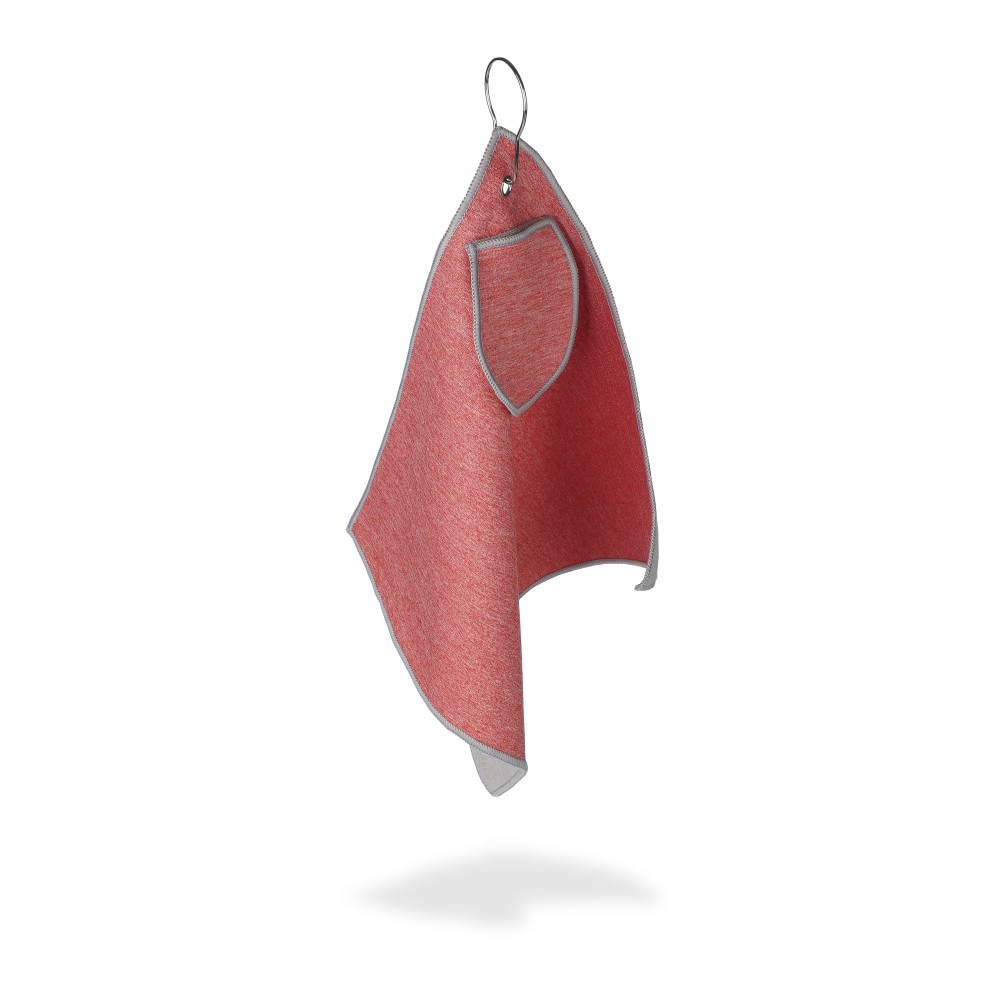 rPET golftörölköző tartozék labdatartó tokkal. A fém kampó segítségével könnyen a táskához csatlakoztatható. Belül rPET címkével. Mosógépben alacsony hőmérsékleten mosható.