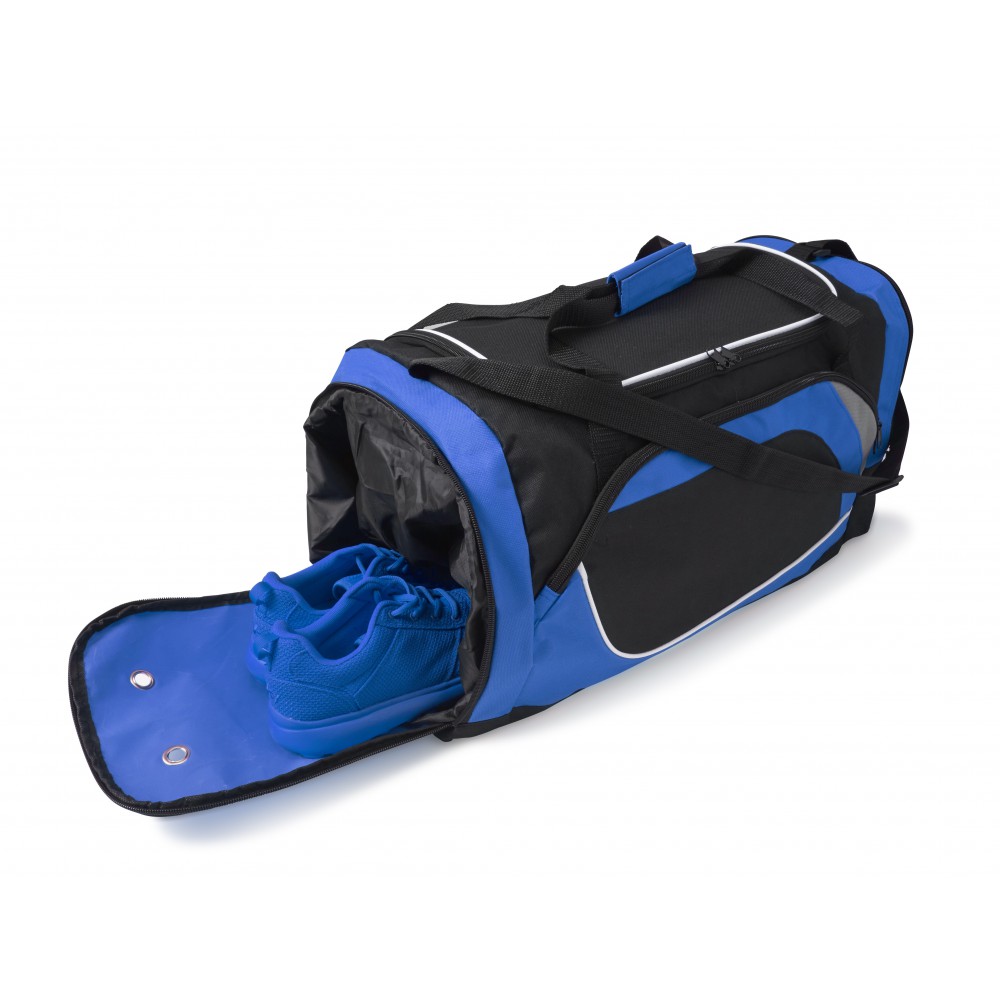 Sporttáska egy nagy főrésszel, egy oldalzsebbel és egy külön rész a cipő számára. 600D poliészter.