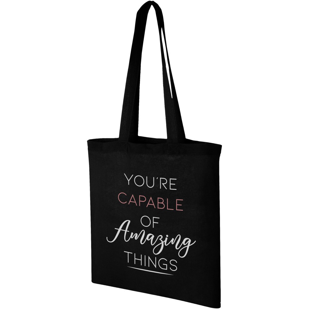 A Carolina táska könnyű és pénztárcabarát, így kiválóan alkalmas reklámhordozó rendezvényeken, konferenciákon vagy kiállításokon. A nagy fő rekesz elegendő helyet biztosít a könnyű tárgyak tárolására, a 30 cm-es vállpántok pedig megkönnyítik a táska szállítását. Fülek magassága 30 cm. 100 g/m2 pamut.