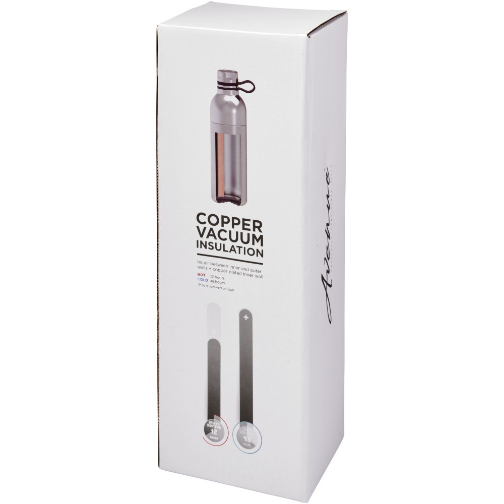 Duplafalú vákuumos, réz szigetelésű palack. Hidegtartó képesség 48 óra, melegtartó képesség 12 óra. A duplafalas kialakításnak köszönhetően nincs párakipacsódás. Szivárgásmentes. Szénsavas italokkal nem használható. Mosogatógépben nem mosható és mikrohullámú sütőben történő melegítésre nem alkalmas. Űrtartalom: 590 ml. Csomagolása Avenue ajándékdoboz. Rozsdamentes acél.